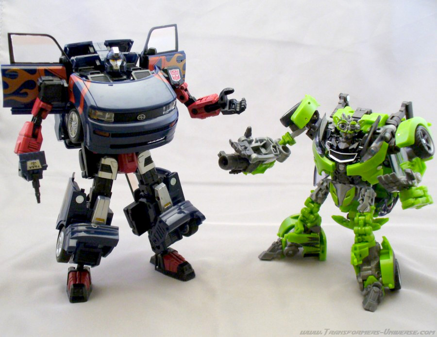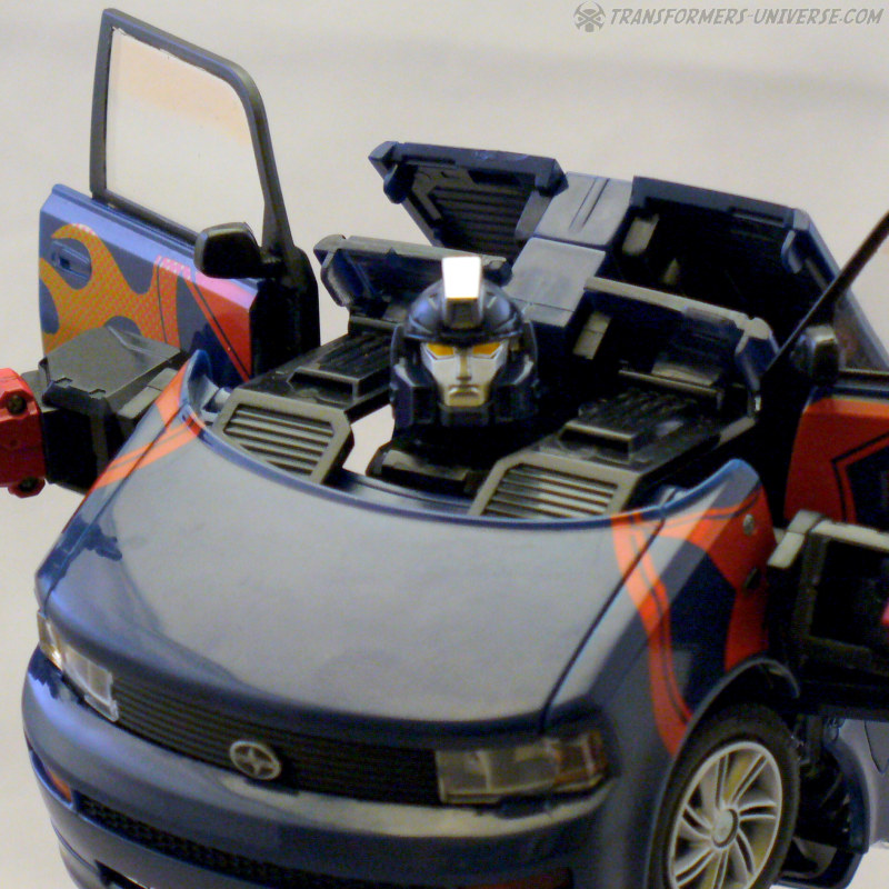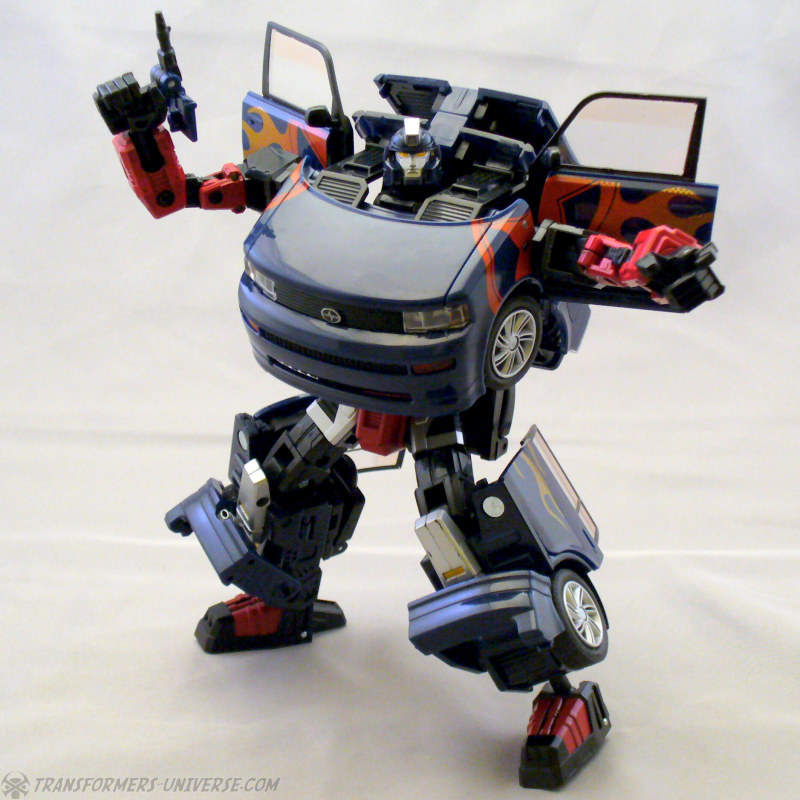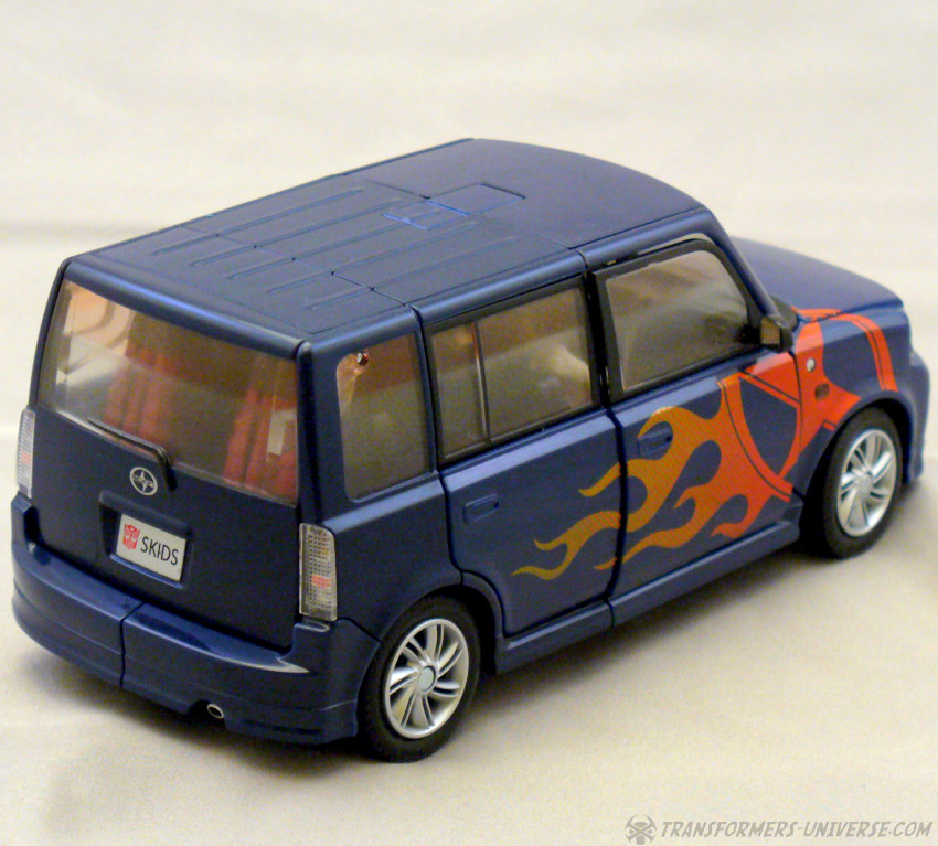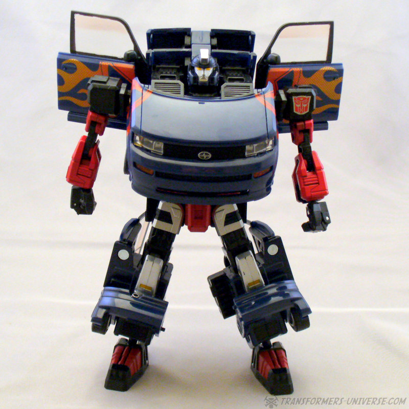 Bemerkungen: Skids, besser bekannt als der Autobot, der beinahe was mit einem menschlichen Cowgirl namens Charlene hatte, erschien 2005 in der Alternators Reihe. Anders als bei seiner Binaltech Version, die ein dem Cartoon Vorbild nachempfundens Blau zeigte, kommt die Alternators Version in einem sehr dunklen Blau daher und hat außerdem noch Flammensticker für die Seiten im Gepäck. Die Figur wurde später in der Binaltech Asterisk Reihe als Broadblast neu verwendet. Leider ohne eine Charlene PVC Figur.
