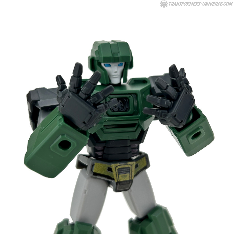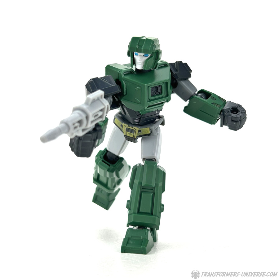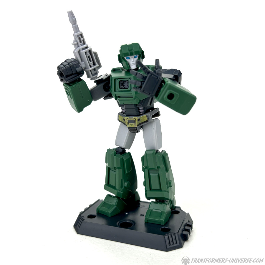 Robot Mode: All Blokees figures are model kits, meaning they come in parts and need assembly. Hound here is the so-called Galaxy Version size class, bigger than the Defenders, smaller than the Classics. The assembly is pretty easy if you follow the instruction sheets (a meta commentary on the movie, perhaps?) and once you’re done you have a Hound figure that is roughly Scout-Class (or very small Deluxe).