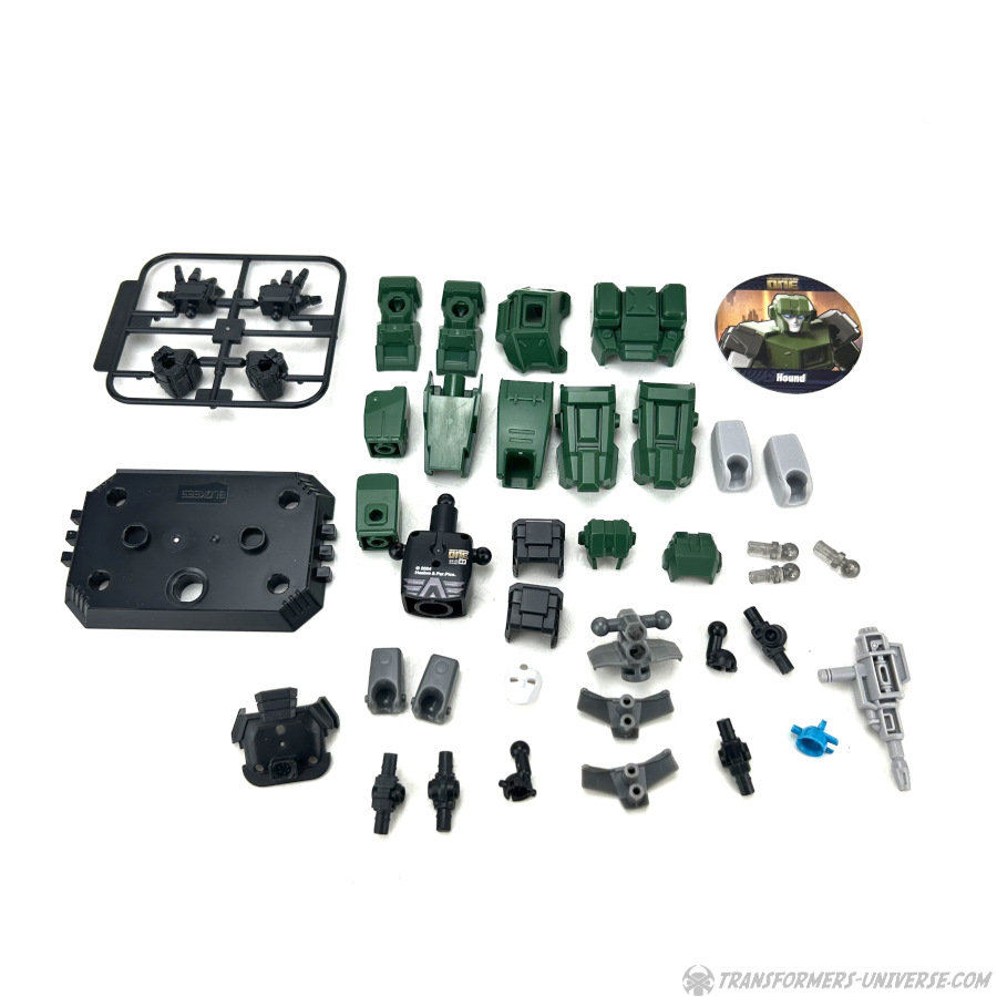 Hound comes with two different sets of hands (closed fists with 5mm holes and open hands) and carries a grey gun as a weapon. Also included is a base for the figure, as well as a disc-shaped cardboard image of Hound.