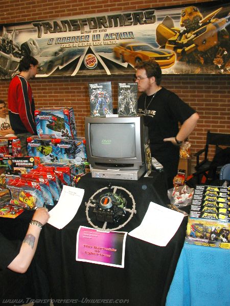 Dann aber der Aufbau. Fünf ziemlich mickrige Tische wurden zusammengeschoben und mit ein wenig Stoff präsentabel gestaltet. In die Mitte kam ein tragbarer Fernseher, auf dem dann den Rest des Tages immer die selben drei Videos laufen sollten. Übrigens vielen Dank, Scourge, dass ich den TF Movie Soundtrack jetzt erstmal für ein paar Wochen weglegen muss, denn sonst würde ich die Scheibe mit Sicherheit aus Überdruss an der Wand zerschmettern.