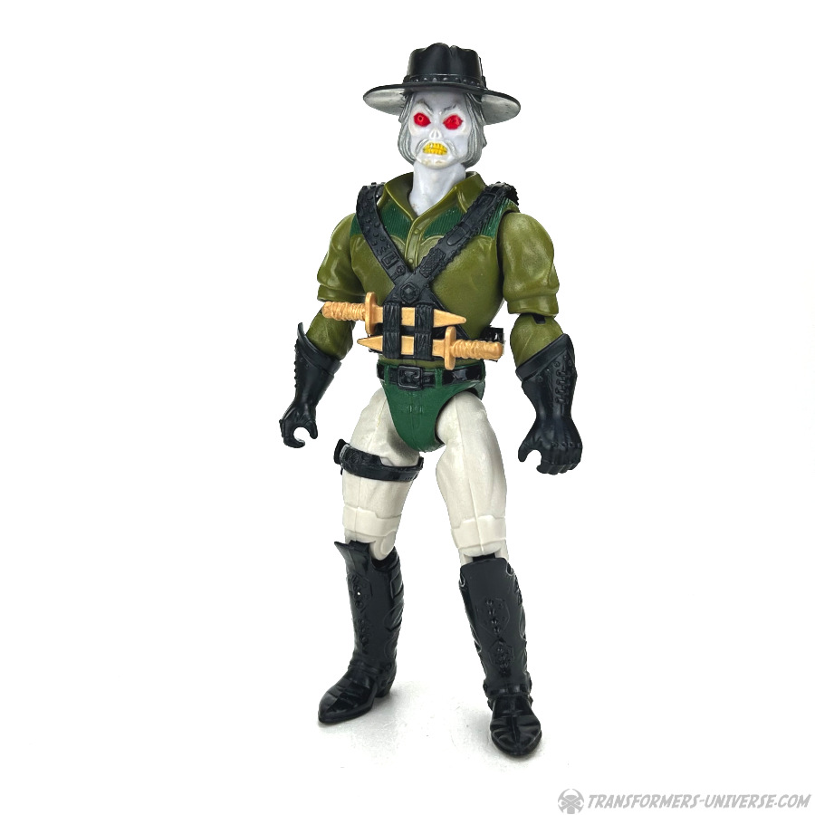 Tex Hex: Wie es oft bei den Bösewichtern aus Cartoon Spielzeugreihen der Fall ist, ist der Bösewicht mehr oder weniger das dunkle Spiegelbild des Helden. Wo also Marshall Bravestarr der gute Cowboy in den hellen Klamotten ist, ist Tex Hex der böse Cowboy mit den dunklen Klamotten. Der Körper ist der gleiche wie der von Bravestarr, nur mit dunkleren Farben, leicht abgewandelten Handschuhen und einem neuen Kopf. Außerdem trägt er einen anderen Hut und einen anderen Brustpanzer samt rausziehbaren Dolchen. Die Waffen wiederum sind die gleichen, eine Handwaffe und ein Gewehr, nur jetzt goldfarben anstatt silbern. Meinem Tex Hex fehlt die Handwaffe, aber ansonsten ist er komplett.