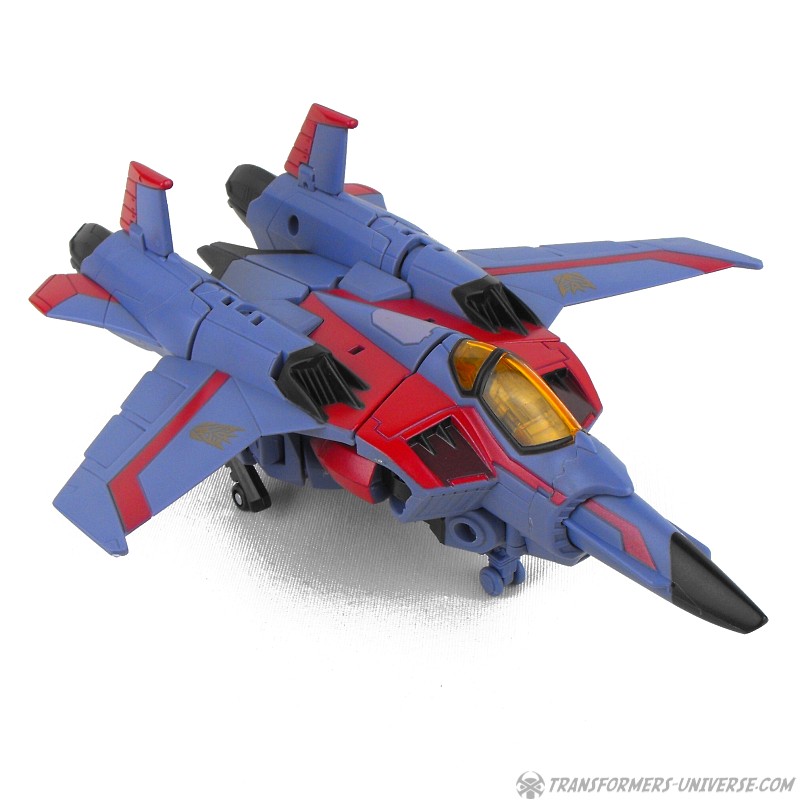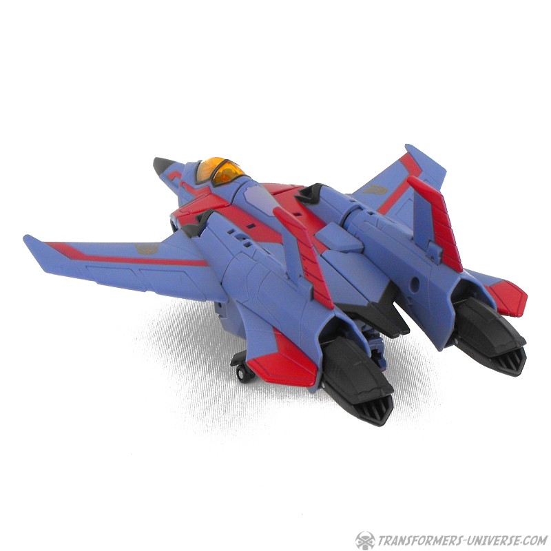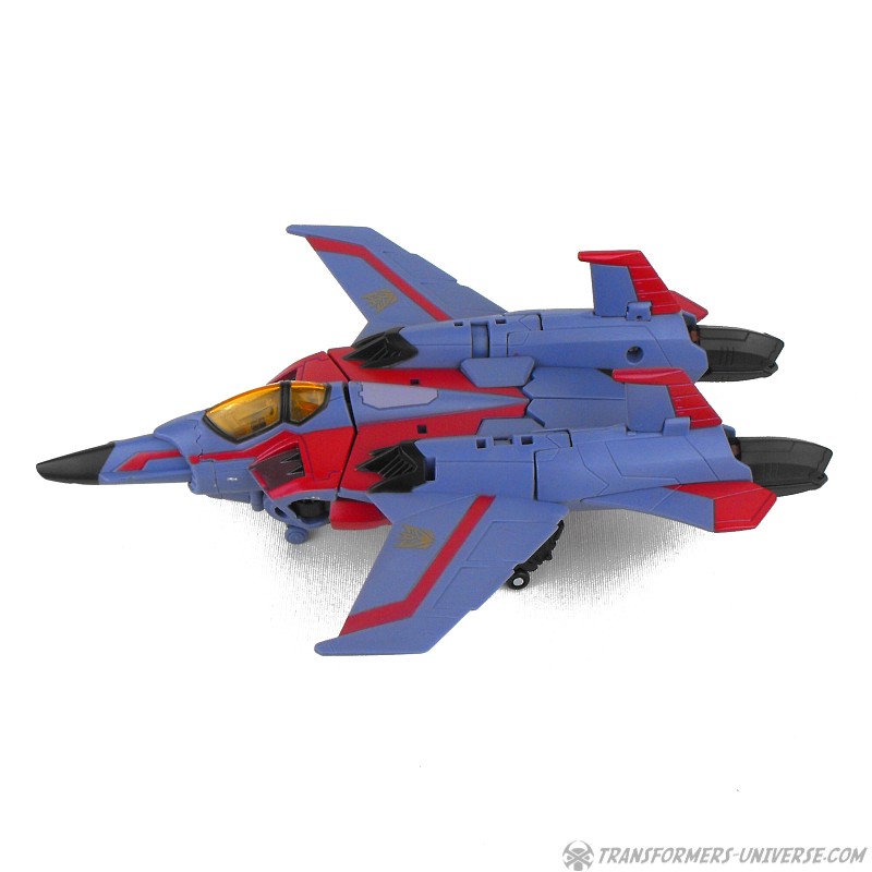 Alternativmodus: Starscreams Alternativmodus ist, wie könnte es anders sein, ein Flugzeug. In diesem Fall handelt es sich um ein völlig fiktives, futuristisches Modell, daß aber auf angenehme Art und Weise an frühere Inkarnationen des machthungrigen Decepticonkriegers erinnert. So besteht sowohl eine große Ähnlichkeit zu G1 Starscream, von dem dieses Exemplar die grundlegende Form und die beiden Heckflossen geerbt hat, als auch zu Armada Starscream, durch den Animated Starscreams nach vorn gerichtete Flügel inspiriert wurden. Alles in allem doch eine optisch sehr gelungene Konstruktion.