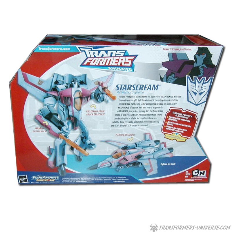 Transformers Animated ist hier keine Ausnahme. Schon in der ersten Folge hat Starscream einen tollen Auftritt und gibt, mit einer relativ kleinen Geste, alles über seinen Charakter Preis, was man wissen sollte: Er macht Megatron ein nettes, kleines „Präsent“ mit wahrhaft „durchschlagendem“ Erfolg. Gegen Ende des Pilotfilms gibt er schon sein zweites Stelldichein und schafft es beinahe sämtliche Autobots auf einmal zu vernichten, und das ohne jede Hilfe. Nur durch puren Zufall kann er dann doch noch besiegt werden.