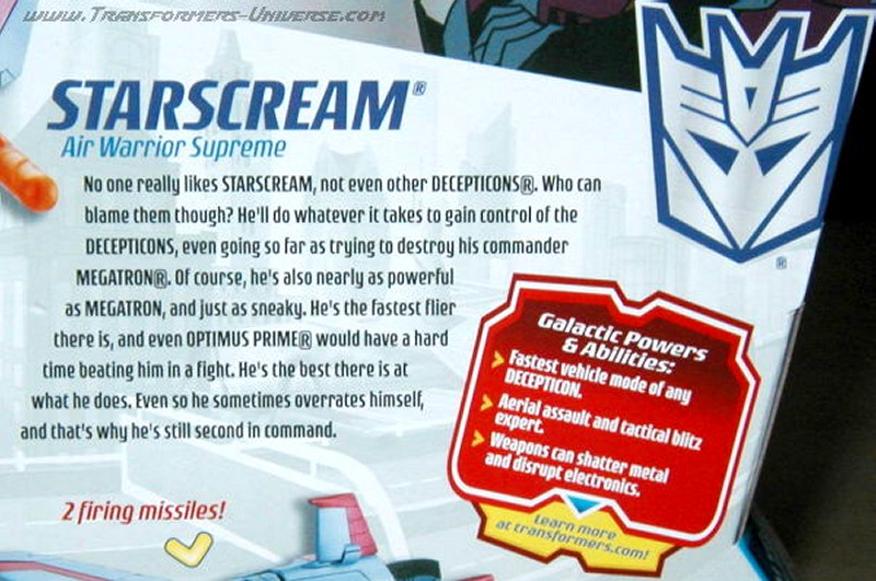 Niemand mag Starscream, nicht einmal die anderen Decepticons. Wen wundert es auch? Er tut was immer notwendig ist um die Kontrolle über die Decepticons zu erlangen, bis hin zum Versuch seinen eigenen Kommandaten, Megatron, zu vernichten. Allerdings ist er auch beinahe so stark wie Megatron und genauso verschlagen. Er ist der schnellste aller Flieger und sogar Optimus Prime würde sich schwer tun ihn im Kampf zu besiegen. Er ist der Beste in seinem Job. Trotzdem überschätzt er sich manchmal, deshalb ist er immer noch nur die Nummer 2.