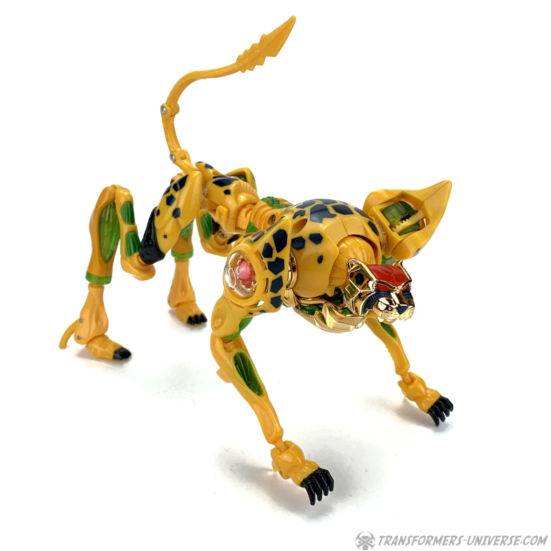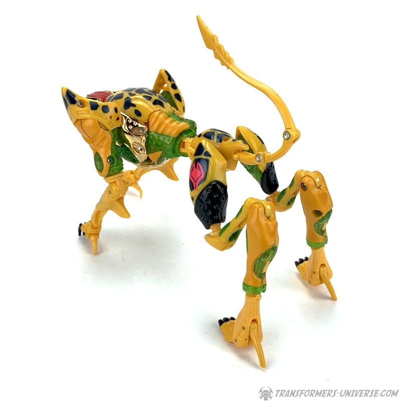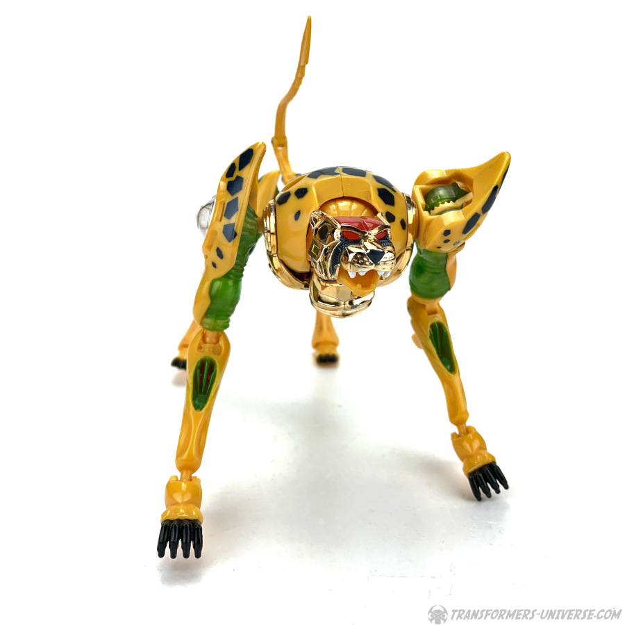 Alternativmodus: Wieder einmal verwandelt sich Cheetor in einen Geparden, diesmal in einen techno-organischen. Genau gesagt ist es nur der Roboter, der auf alle viere runter geht, und den Roboterkopf gegen einen Tierkopf tauscht (was länger dauert als der gesamte Rest der Transformation). Der Gepard sieht so nicht schlecht aus, aber die Proportionen sind ziemlich übertrieben. Extrem lange Beine, sehr schlanker Unterkörper, mächtiger Brustkorb, ihr seht's ja selber.