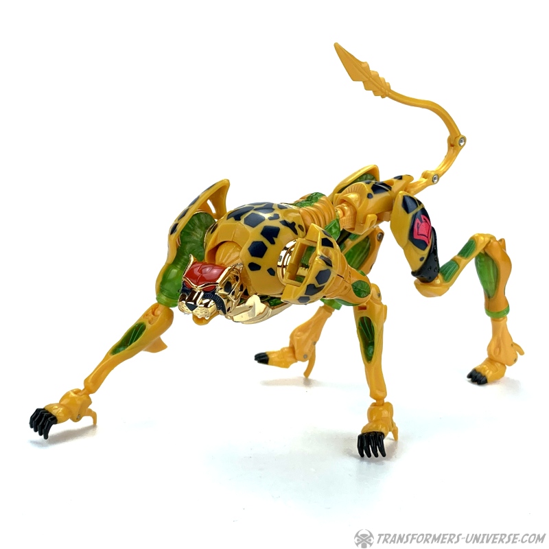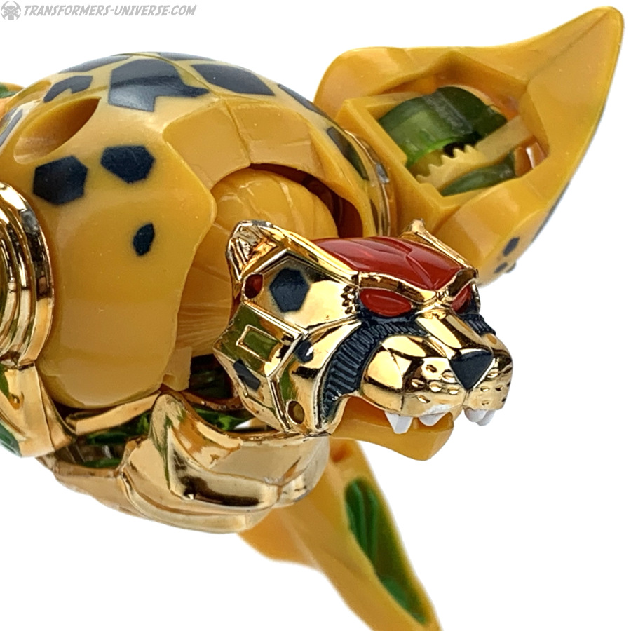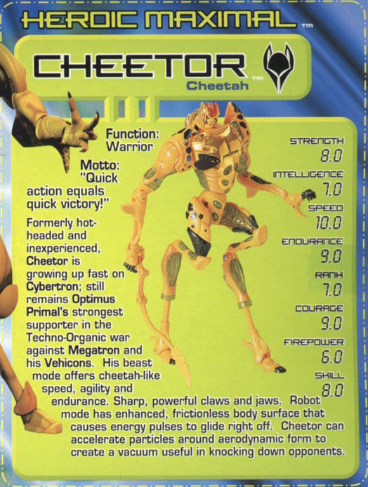 Der ehemals heißblütige und unerfahrene Cheetor wird auf Cybertron schnell erwachsen. Er ist immer noch Optimus Primals stärkster Verbündeter im techno-organischen Krieg gegen Megatrons und seine Vehicons. Sein Biestmodus bietet ihm Gerparden-hafte Schnelligkeit, Beweglichkeit und Durchhaltekraft. Scharfe, mächtige Klauen und Kiefer. Sein Robotermodus hat eine verstärkte, reibungslose Außenhaut, die Energiepulse einfach abgleiten lässt. Cheetor kann um seine aerodynamische Form herum Partikel beschleunigen und ein Vakuum erzeugen, um Gegner umzustoßen.