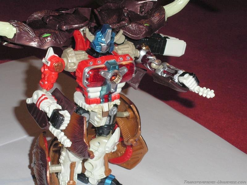 Die Frage ist, wie es mit der Beweglichkeit des Mammuts aussieht. Sie ist durchaus gegeben, wenn auch ein wenig Rücksicht auf den Robotermodus genommen wurde. So besitzt Big Convoy in diesem Modus zum Beispiel keine beweglichen Knie. Die Beine lassen sich jedoch an den Schultern, respektive der Hüfte, in einem Maße bewegen, wie es zu einem Mammut durchaus paßt. Auch der Kopf läßt sich nicht bewegen, bewahrt dafür allerdings den einheitlichen Felllook.