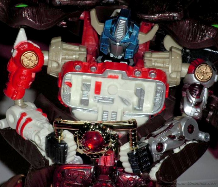 Aber Big Convoy wäre kein Anführer, wenn er nicht noch das ein oder andere Extra mit sich bringen würde. So hat er zum Beispiel zwei “Ankerkanonen” an den Unterschenkeln, die sehr stark denen von Beast Wars Megatron ähneln. Aber es gibt noch mehr. An den Unterarmen befinden sich ausfahrbare Schlagstöcke. Seine Primärwaffe, eine wahrhaft gewaltige Kanone, besitzt die Möglichkeit gleich zwei Raketen abzufeuern. Außerdem kann Big Convoy sie, wie schon weiter oben erwähnt, auf dem Rücken tragen.