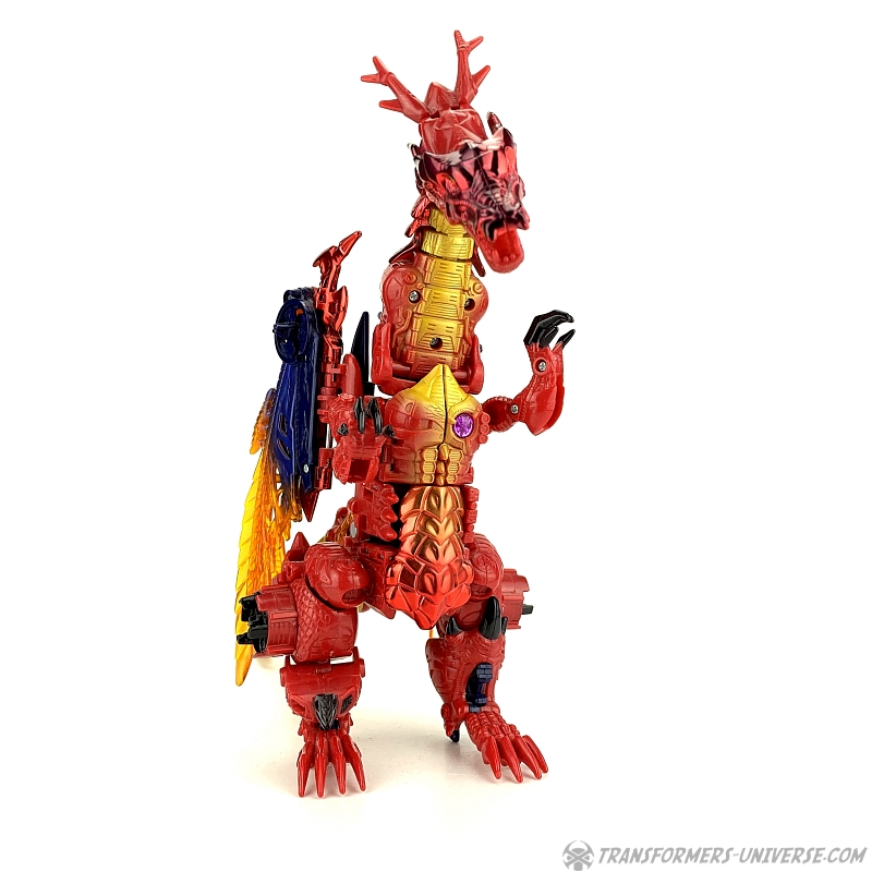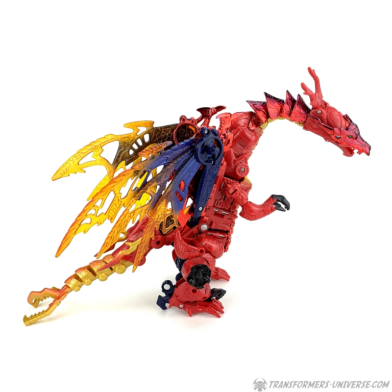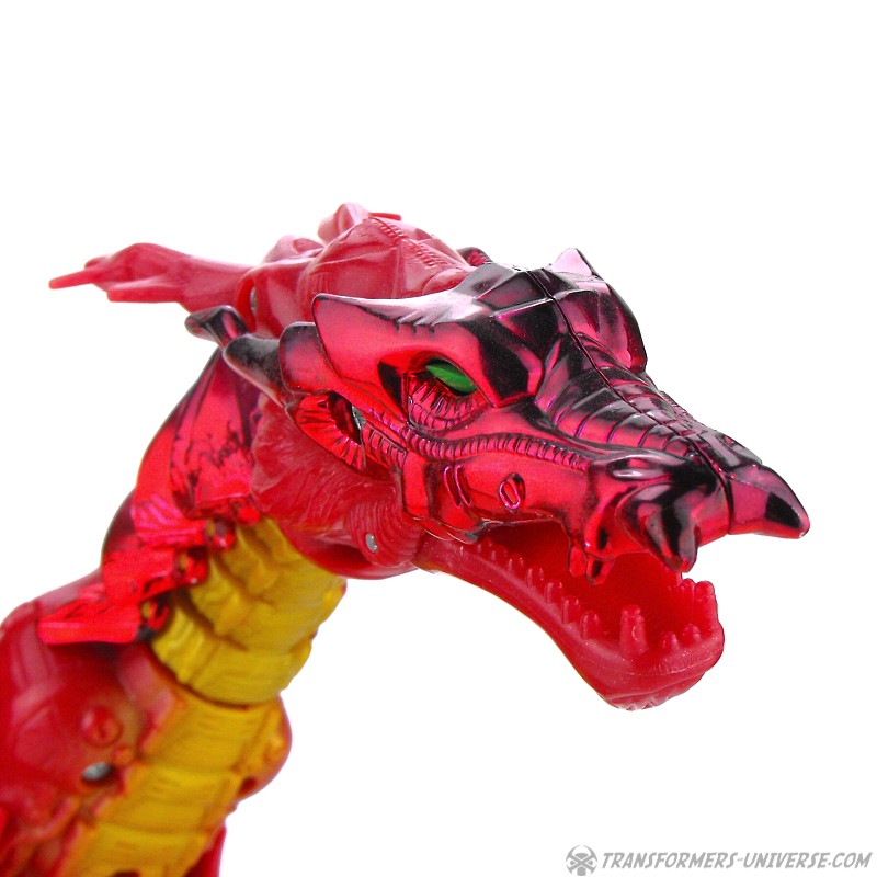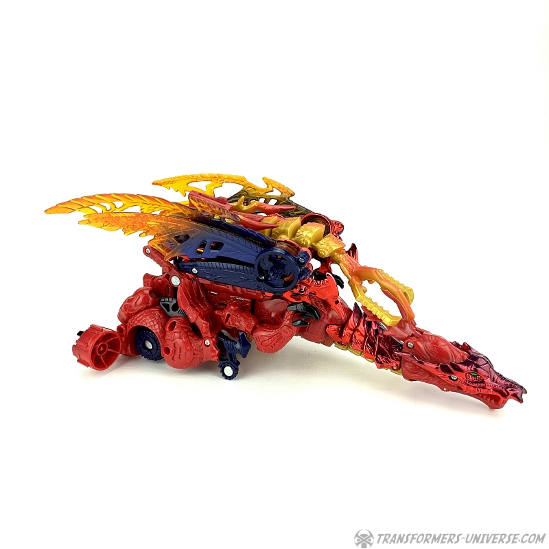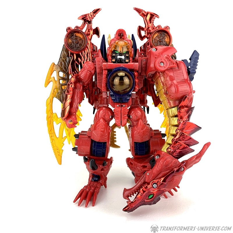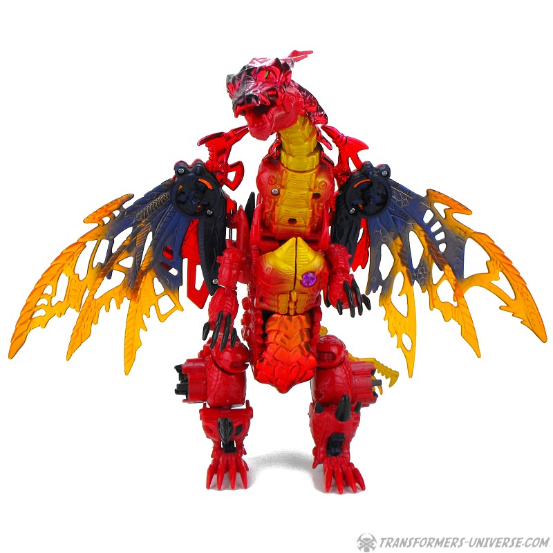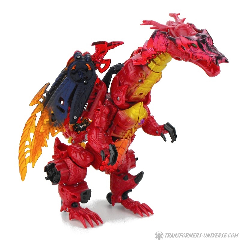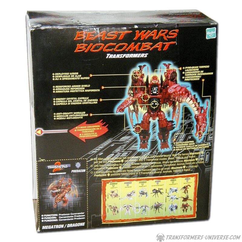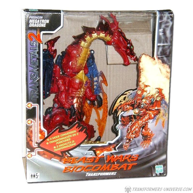 Megatron - Tyrann, böses Genie und Anführer der Predacons - vereint rohe Kraft, militärische Gerissenheit, Rücksichtslosigkeit und Terror um grausame Unterdrückung zu erreichen. Er verband sich mit dem Spark des originalen Megatron und wurde in einen Vulkan geworfen, aus dem er in seiner bisher passendsten Inkarnation hervorstieg: Dem Drachen. Speit Pyrostrahlen-Torpedos die tausendmal heißer als Öl brennen. Setzt seine Flügel im Beast-, Fahrzeug- und Robotermodus ein und fliegt bis zu 400 Meilen pro Stunde schnell. Der Schwanz feuer elektrostatische Energie und fängt Feinde für die spätere Folter ein. Kann als Bodenfahrzeug bis zu 250 Meilen pro Stunde schnell fahren und bleibt voll kampftauglich. Hat jetzt Schwierigkeiten seine Wut zu kontrollieren und hinterlässt Feuer und Vernichtung auf seinem Weg. Megatron erkennt diese Schwäche, glaubt aber dass seine neue Transmetal 2 Form ihn stark genug machen wird Optimal Optimus zu besiegen.
