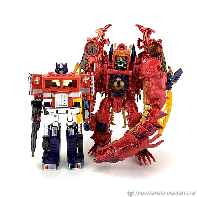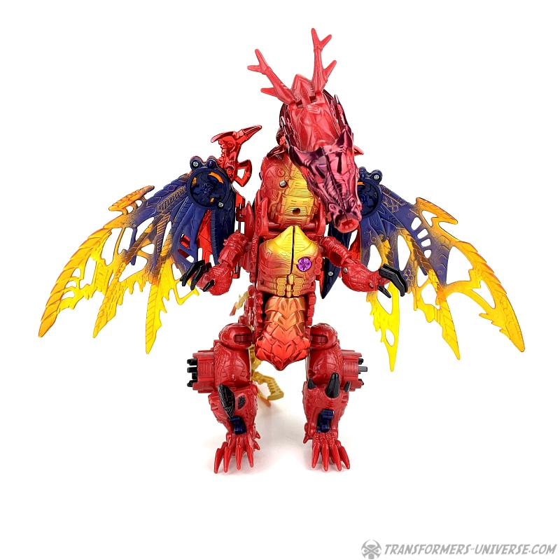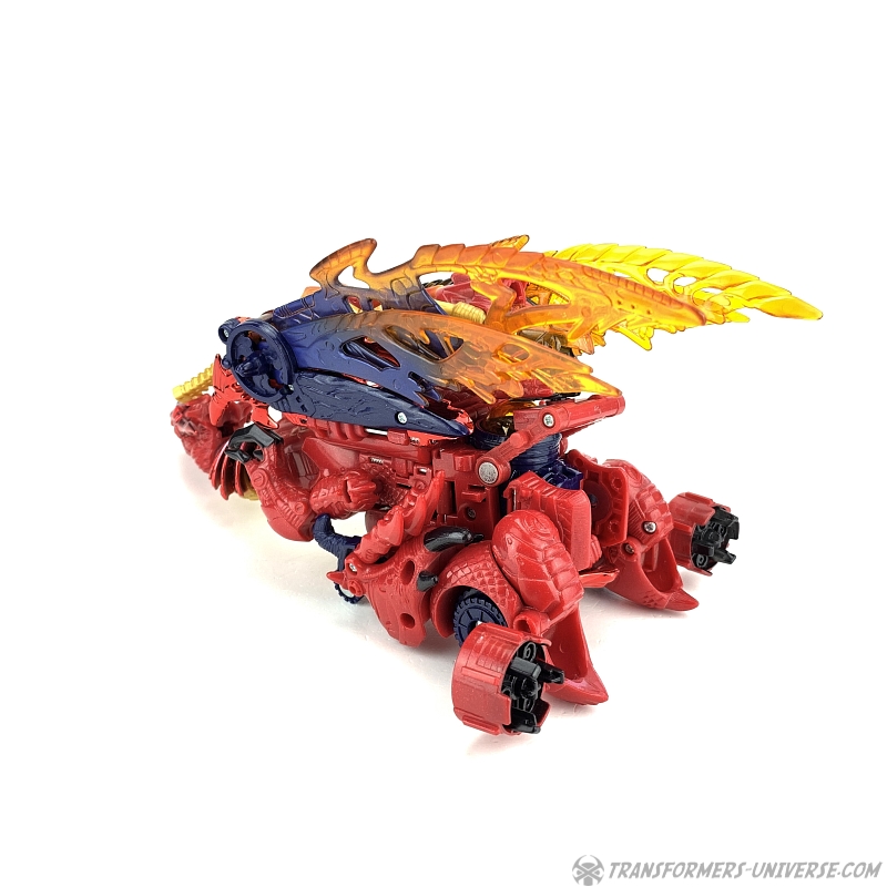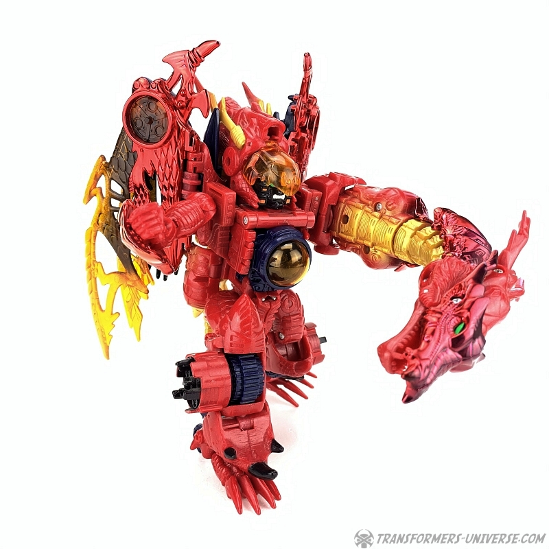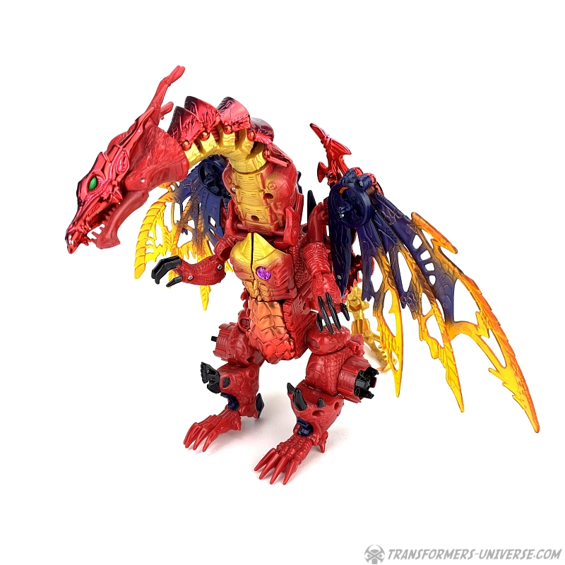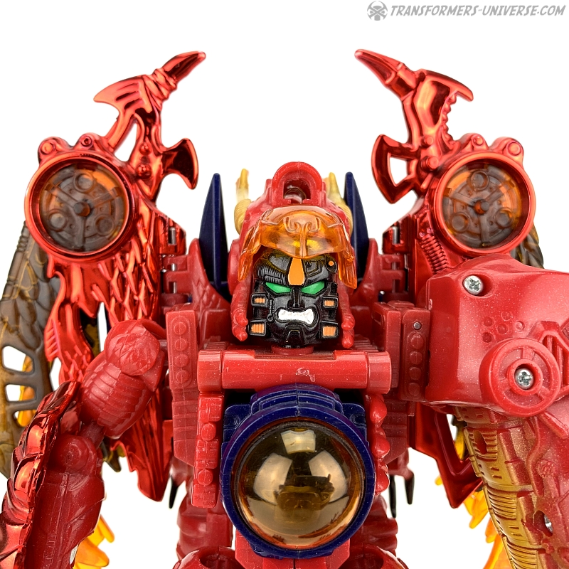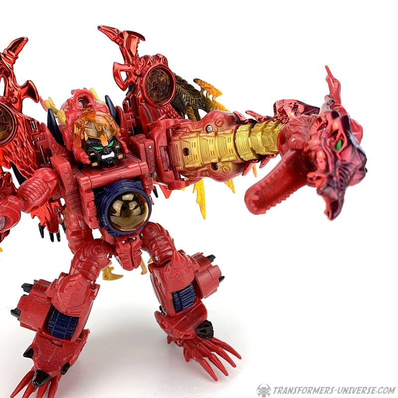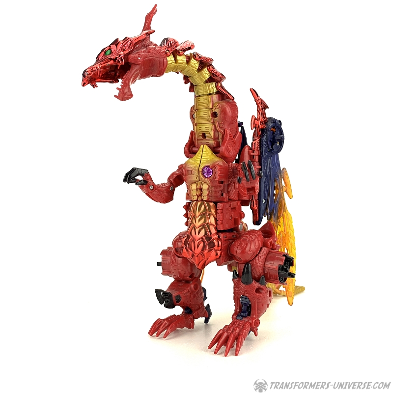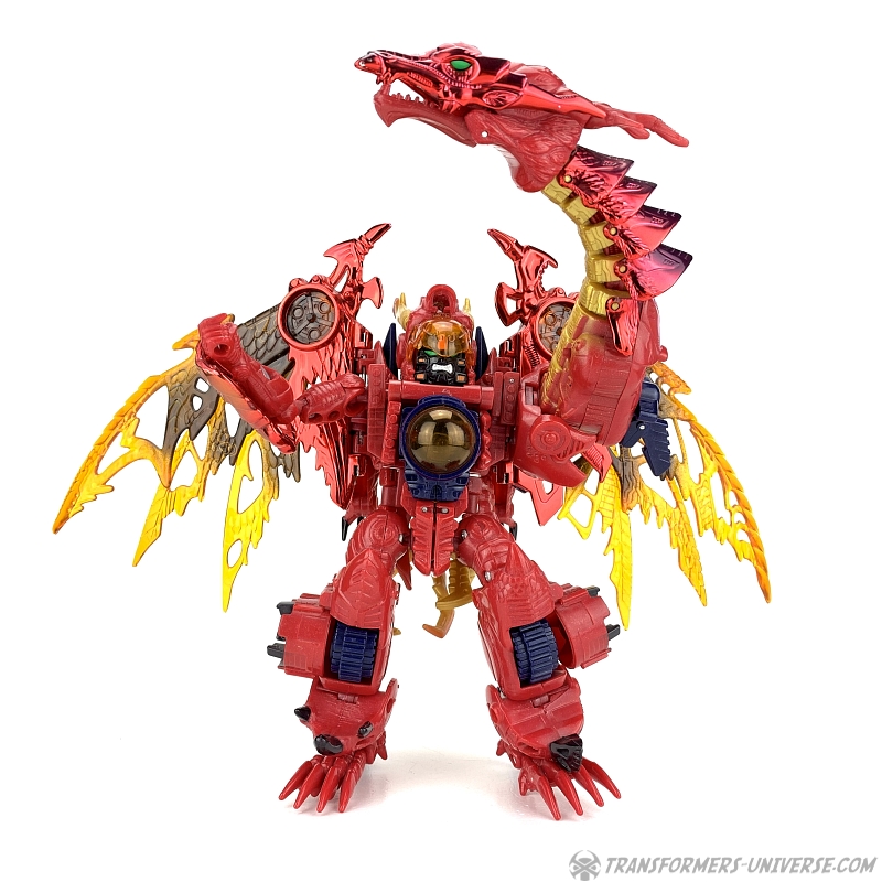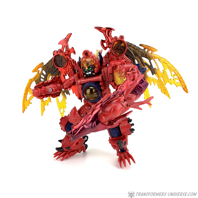Megatron - Tyrann, böses Genie und Anführer der Predacons - vereint rohe Kraft, militärische Gerissenheit, Rücksichtslosigkeit und Terror um grausame Unterdrückung zu erreichen. Er verband sich mit dem Spark des originalen Megatron und wurde in einen Vulkan geworfen, aus dem er in seiner bisher passendsten Inkarnation hervorstieg: Dem Drachen. Speit Pyrostrahlen-Torpedos die tausendmal heißer als Öl brennen. Setzt seine Flügel im Beast-, Fahrzeug- und Robotermodus ein und fliegt bis zu 400 Meilen pro Stunde schnell. Der Schwanz feuer elektrostatische Energie und fängt Feinde für die spätere Folter ein. Kann als Bodenfahrzeug bis zu 250 Meilen pro Stunde schnell fahren und bleibt voll kampftauglich. Hat jetzt Schwierigkeiten seine Wut zu kontrollieren und hinterlässt Feuer und Vernichtung auf seinem Weg. Megatron erkennt diese Schwäche, glaubt aber dass seine neue Transmetal 2 Form ihn stark genug machen wird Optimal Optimus zu besiegen.