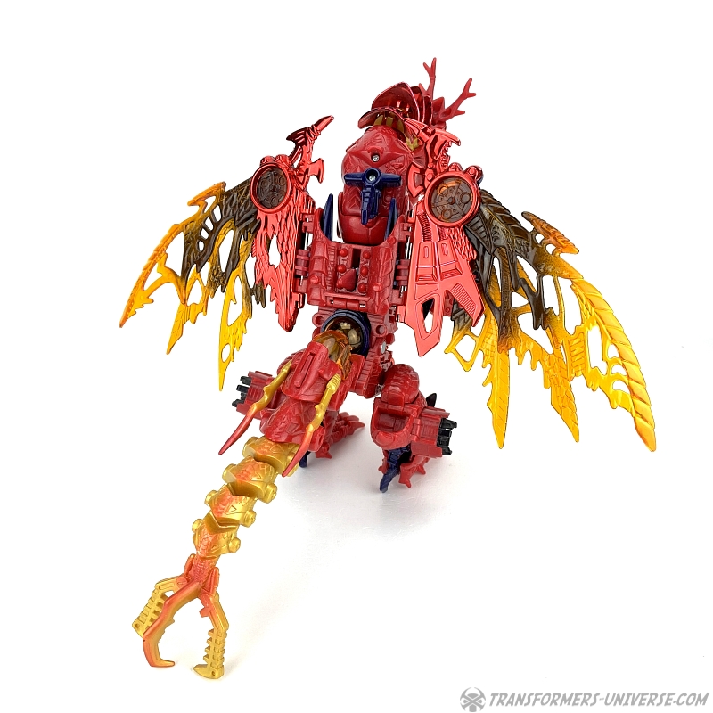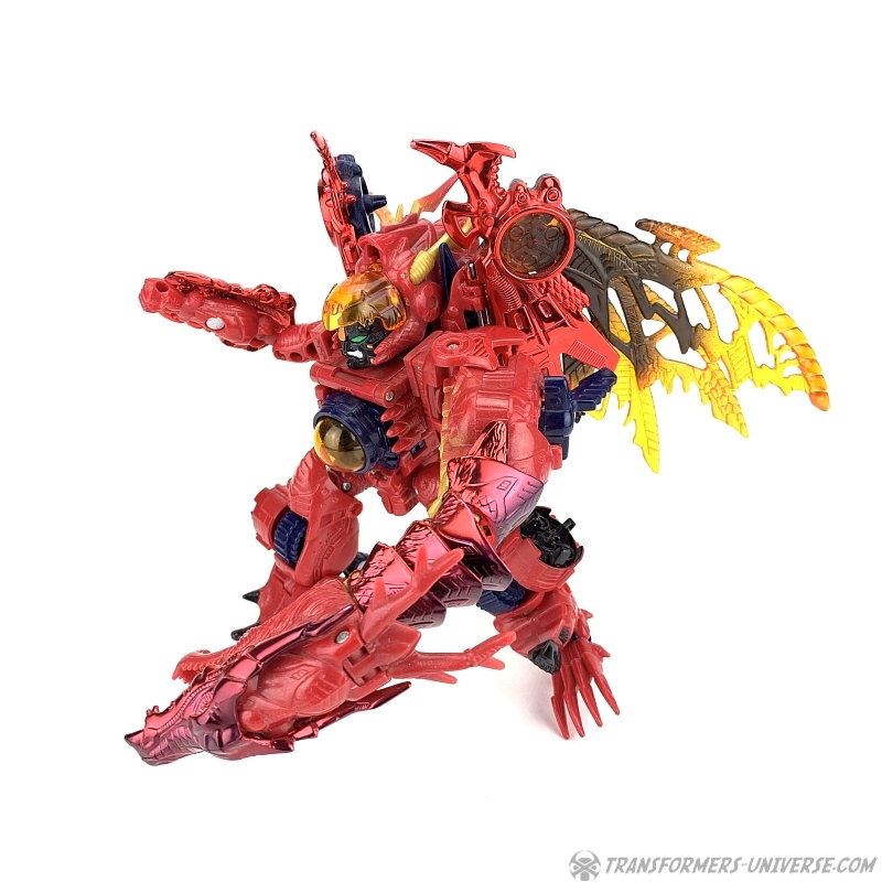 Roboter Modus: Wieder einmal eine sehr nahe am TV-Ebenbild angelehnte Figur, hier erscheint Megatron genauso wie in den letzten paar Folgen der Beast Wars Serie. Leider hat die Figur (genau wie der TV Charakter) ein paar Probleme. Das Größte ist, dass er mit dem schwarzen Kopf so aussieht, als trage er einen roten Gummianzug. Seine Beweglichkeit ist gut, wenn auch durch die Flügel am Rücken und den langen Drachenhals, der den linken Arm bildet, ein wenig eingeschränkt. Der Drachenhals ist aus Gummi, was einige Probleme aufwirft, da er sich nicht ausrichten lässt. Hätten sie hier Plastik oder was stabileres benutzt wäre es wesentlich einfacher gewesen Megs in Posen zu werfen, so hängt der linke Arm eigentlich immer nur runter. Alles in allem ein guter Roboter mit ein paar Designschwächen.