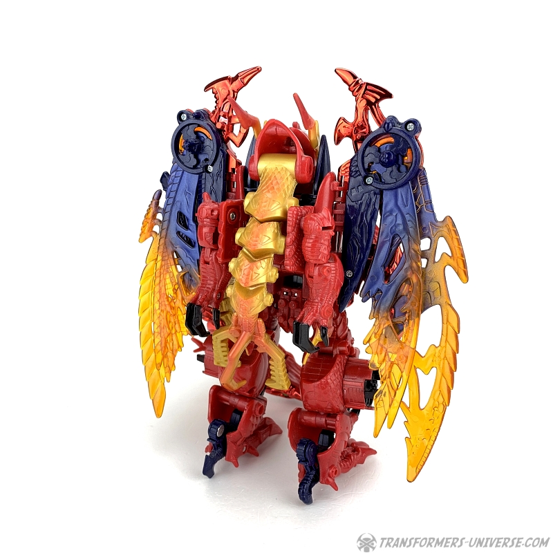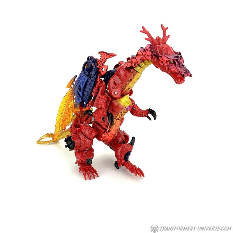Die Figur ist gut, wäre aber besser gewesen wenn sie für den Hals des Drachen was anderes als Gummi benutzt hätten. Das Gummi wird zu einem echten Problem im Robotermodus und hilft auch dem Drachenmodus nicht gerade weiter. Davon abgesehen eine gute Figur, die man sich bei ordentlichem Preis durchaus anschaffen kann. Kleine Anekdote dazu: In Birmingham gab es Megs zweimal, einmal meinen und einmal einen in einer Box, wo auch die Inlays noch drin waren. Die Box mit Inlays war gleich zehn Pfund teuerer, hab' sie also da gelassen. So kann's gehen.