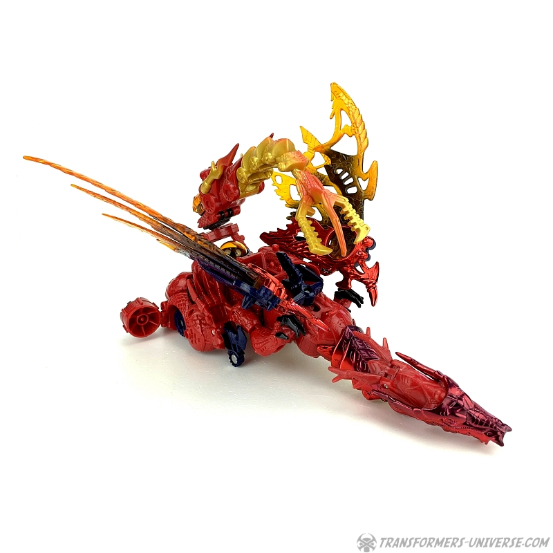 Biest Modus: Megatron verwandelt sich in einen geflügelten Drachen und macht das auch verdammt gut. Die Probleme mit dem Gummihals bleiben natürlich, sind in diesem Modus aber nicht so gravierend. Ein lustiges Detail: Der Kopf des Robotermodus ist jetzt an der Basis des Schwanzes, hängt dem Drachen also am Arsch. Egal, ein guter Biestmodus, der sich in so eine Art Bodenfahrzeug verwandeln lässt. Weiß nicht genau, was es eigentlich sein soll. Lasst ihn lieber als Drachen.