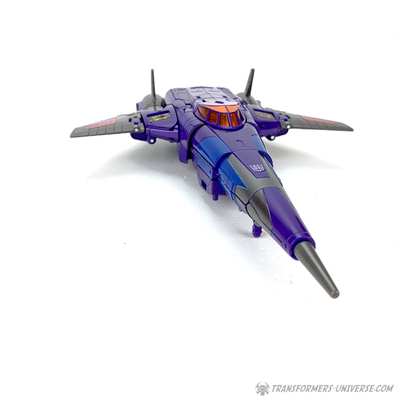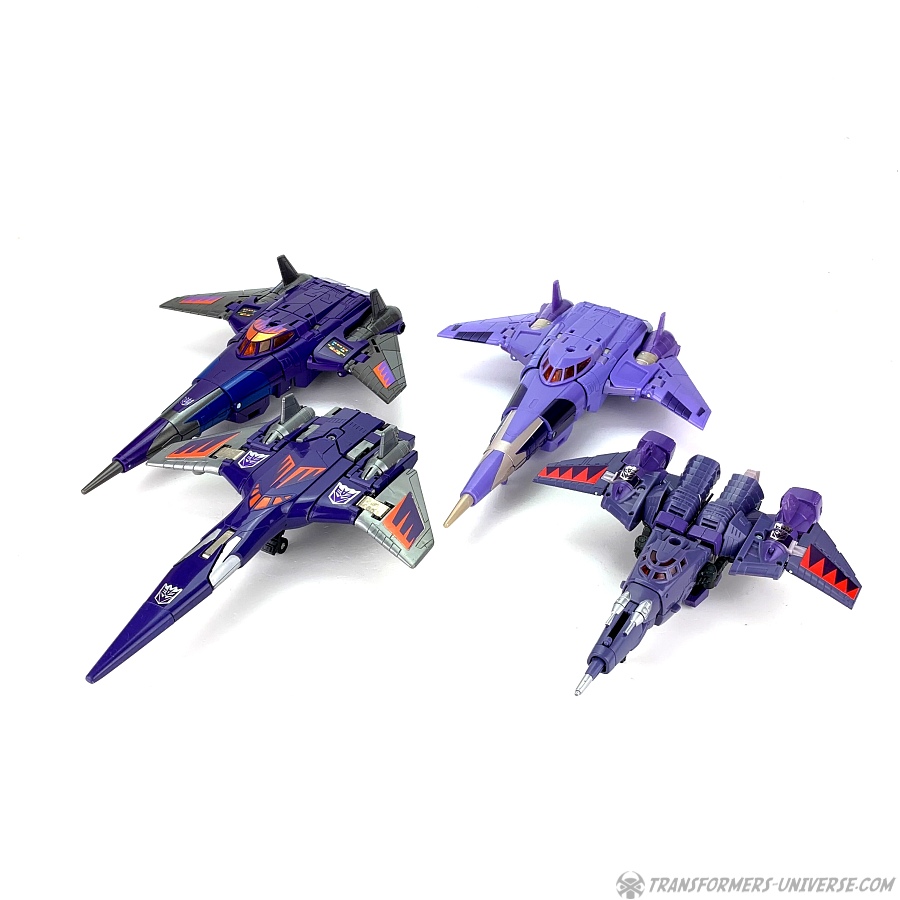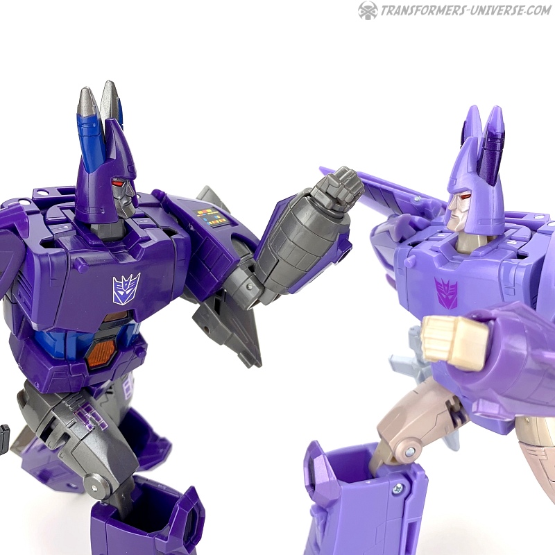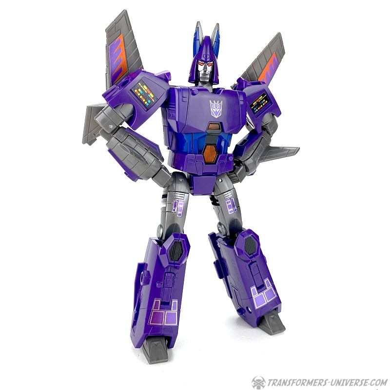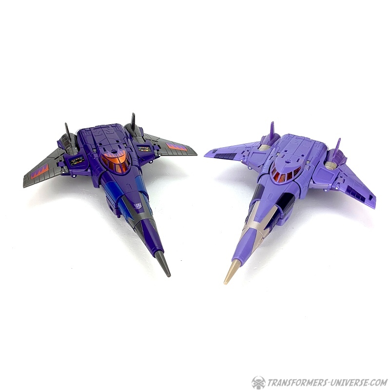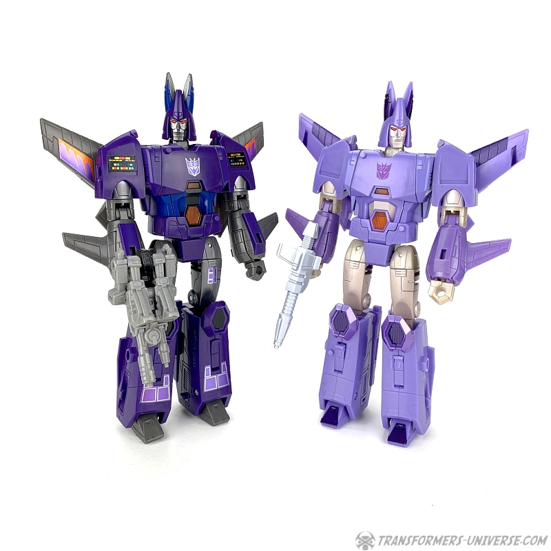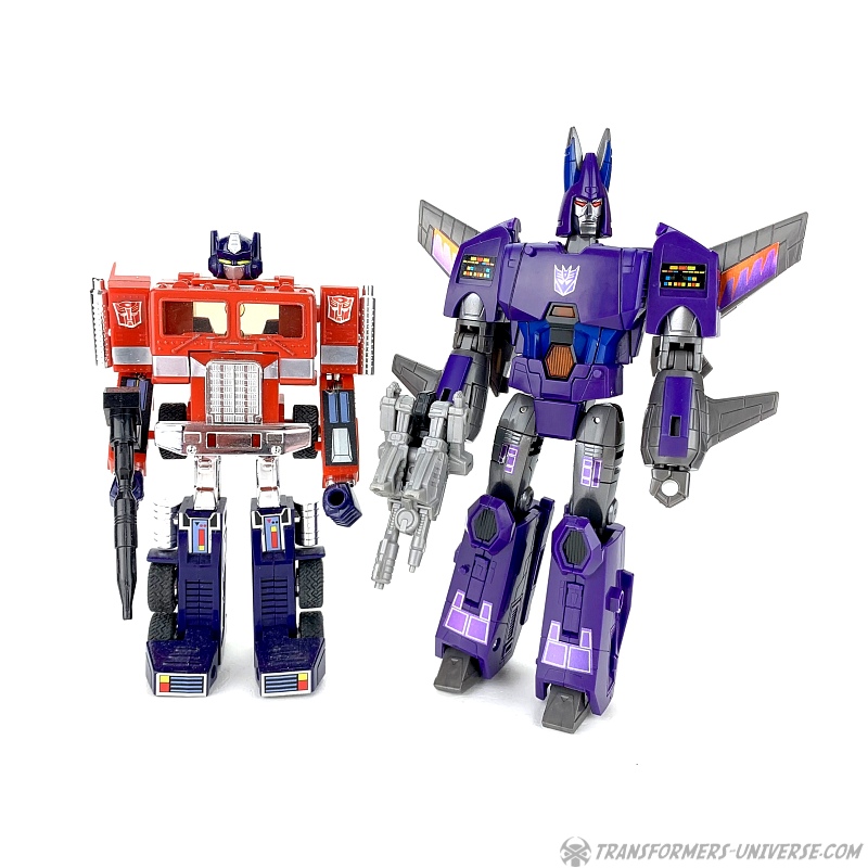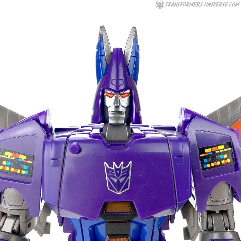Bemerkungen: Fast jeder Generation 1 Charakter sah in Spielzeugform irgendwie anders aus als auf dem Bildschirm. Wir hatten extreme Beispiele wie Ironhide und Ratchet auf der einen und Charaktere wie Optimus Prime auf der anderen Seite, die auf dem Bildschirm lediglich etwas stromlinienförmiger aussahen als die Figur. Cyclonus liegt irgendwo zwischen diesen beiden Extremen. Seine Originalfigur war sicherlich klobiger als der Movie Charakter und hatte deutlich dunklere Farben, aber man konnte ihn klar erkennen.