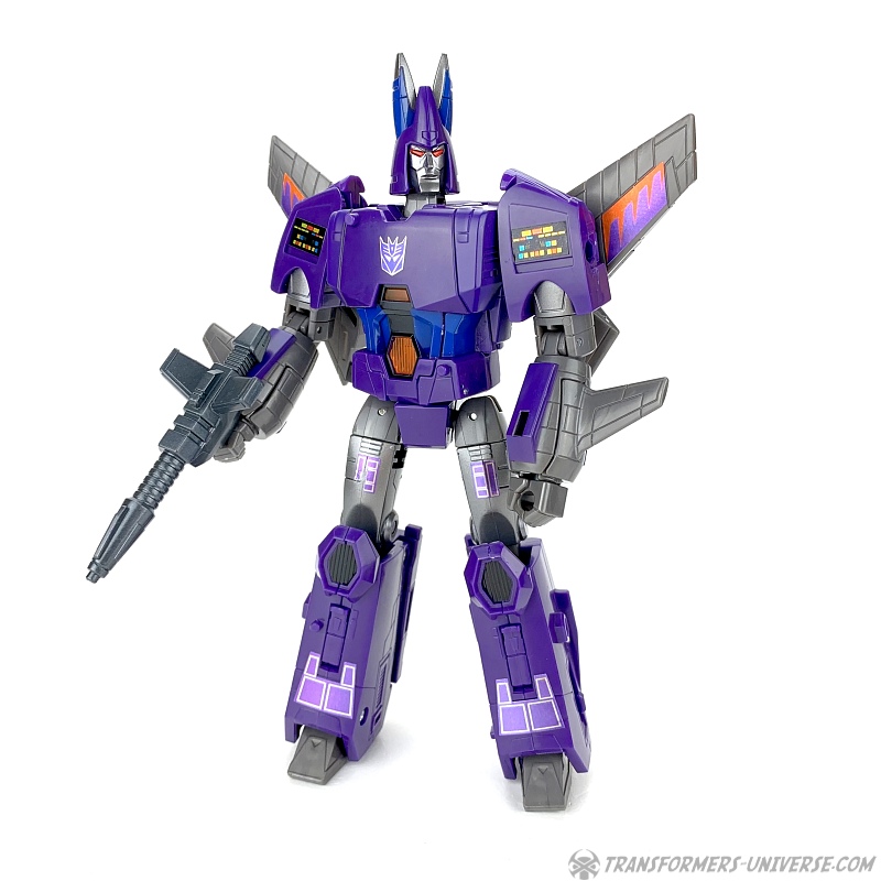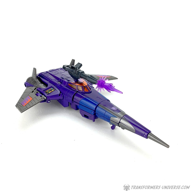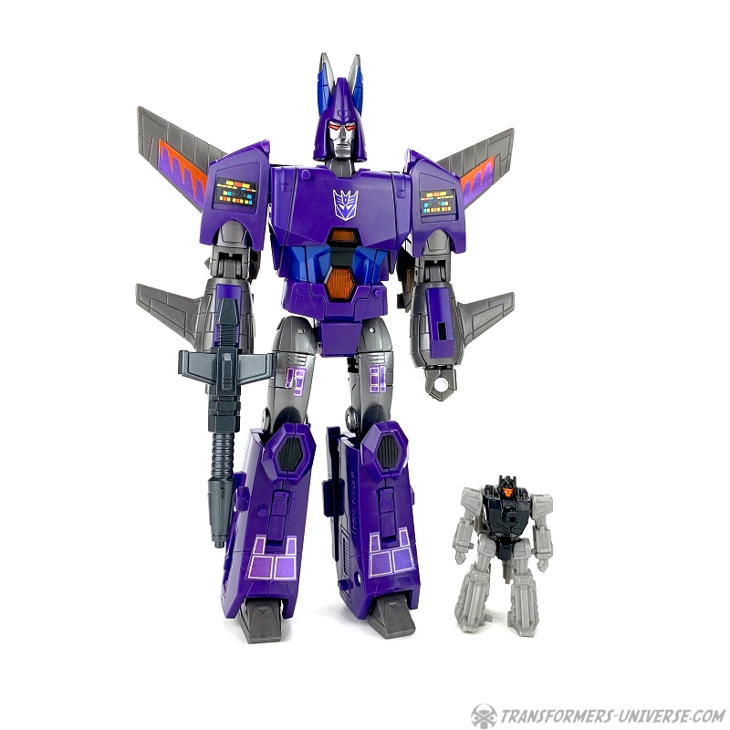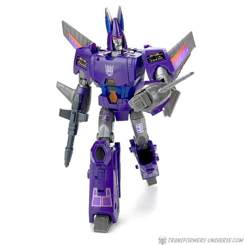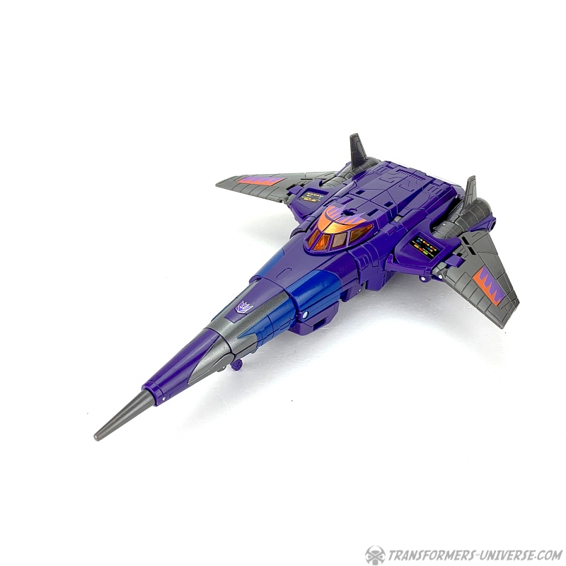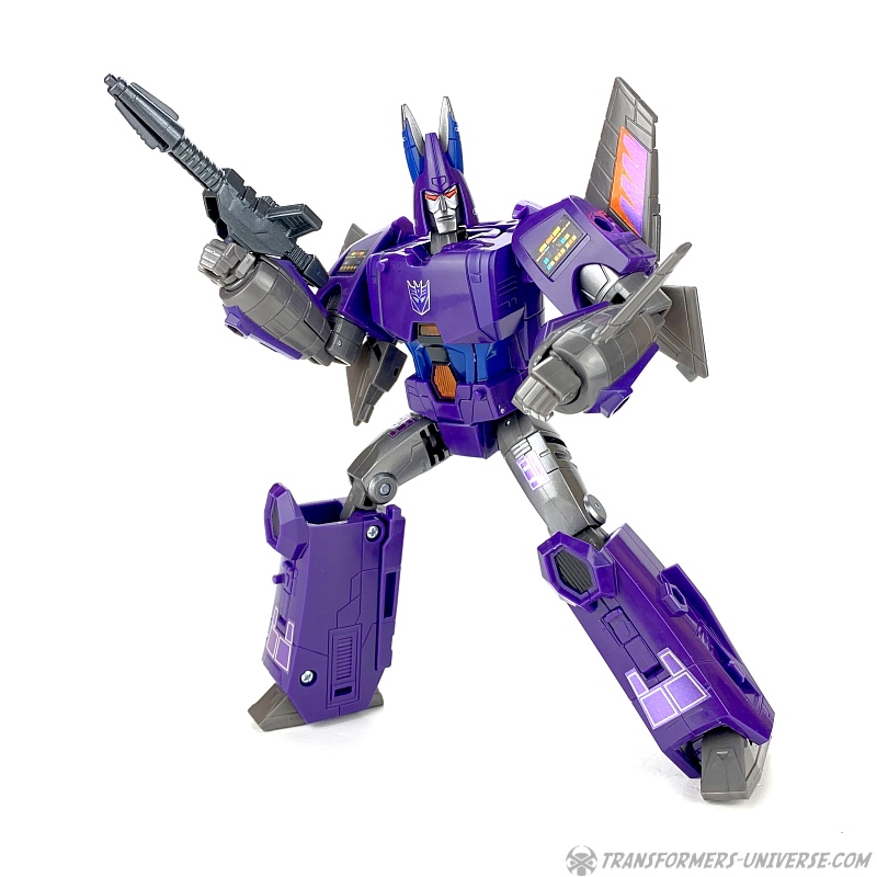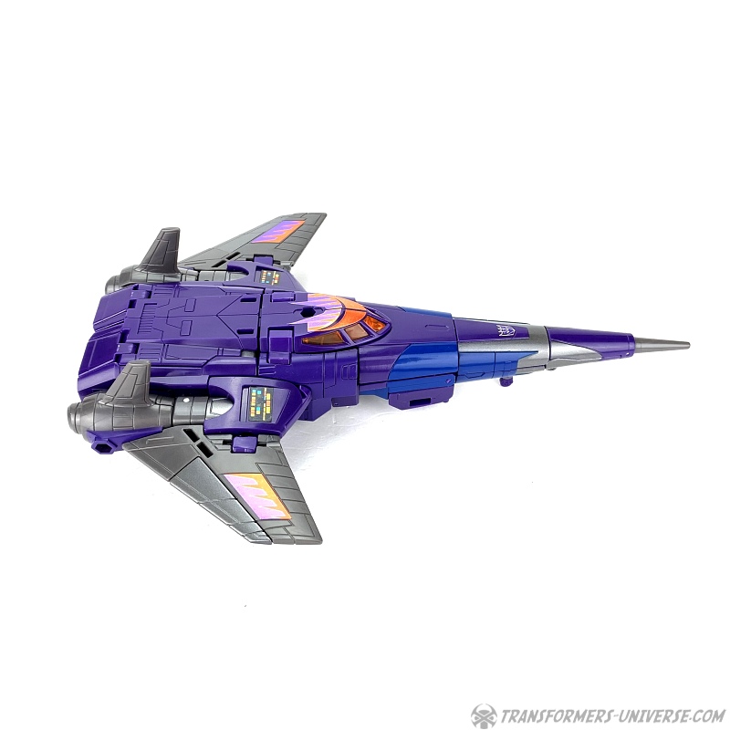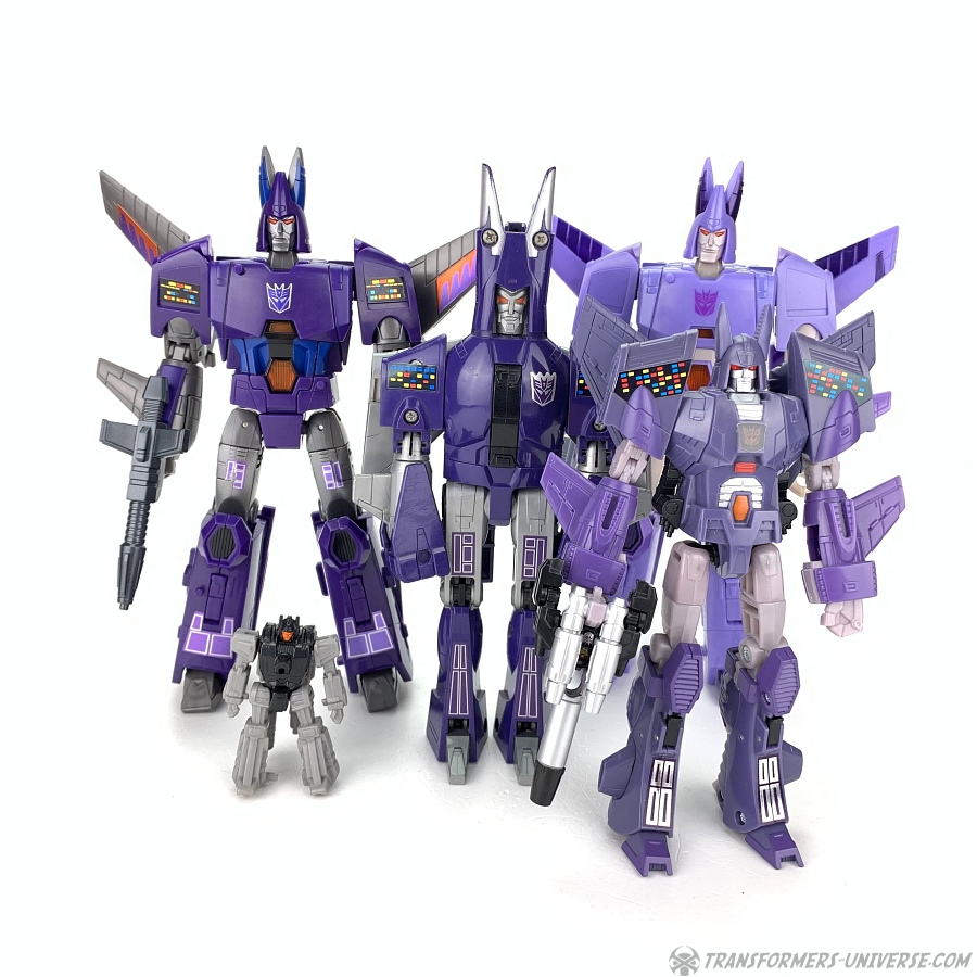 Bemerkungen: Fast jeder Generation 1 Charakter sah in Spielzeugform irgendwie anders aus als auf dem Bildschirm. Wir hatten extreme Beispiele wie Ironhide und Ratchet auf der einen und Charaktere wie Optimus Prime auf der anderen Seite, die auf dem Bildschirm lediglich etwas stromlinienförmiger aussahen als die Figur. Cyclonus liegt irgendwo zwischen diesen beiden Extremen. Seine Originalfigur war sicherlich klobiger als der Movie Charakter und hatte deutlich dunklere Farben, aber man konnte ihn klar erkennen.