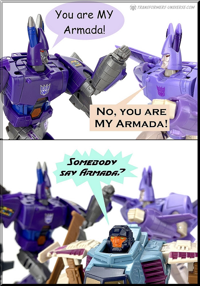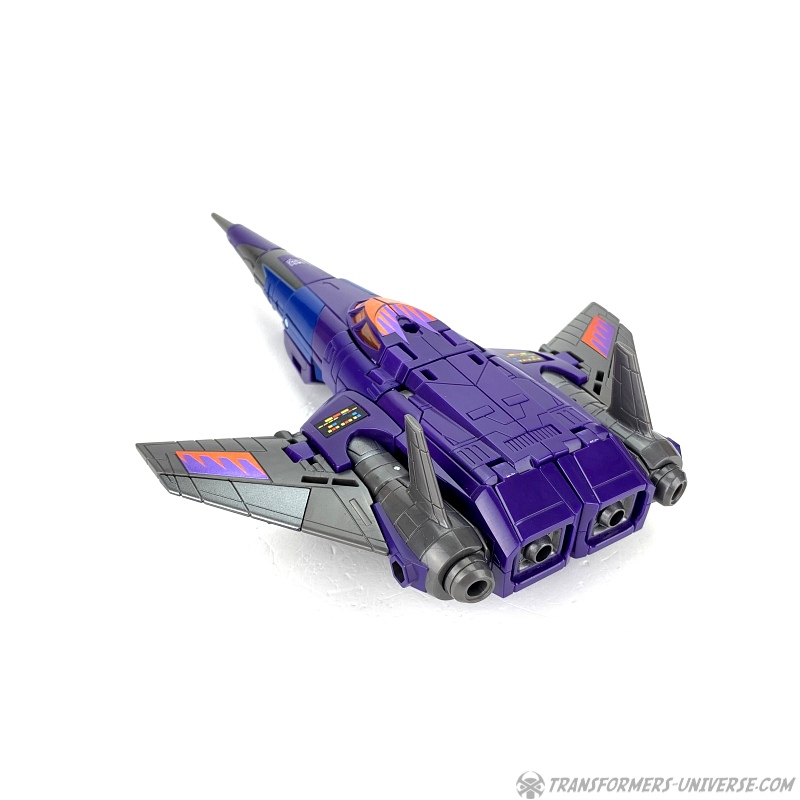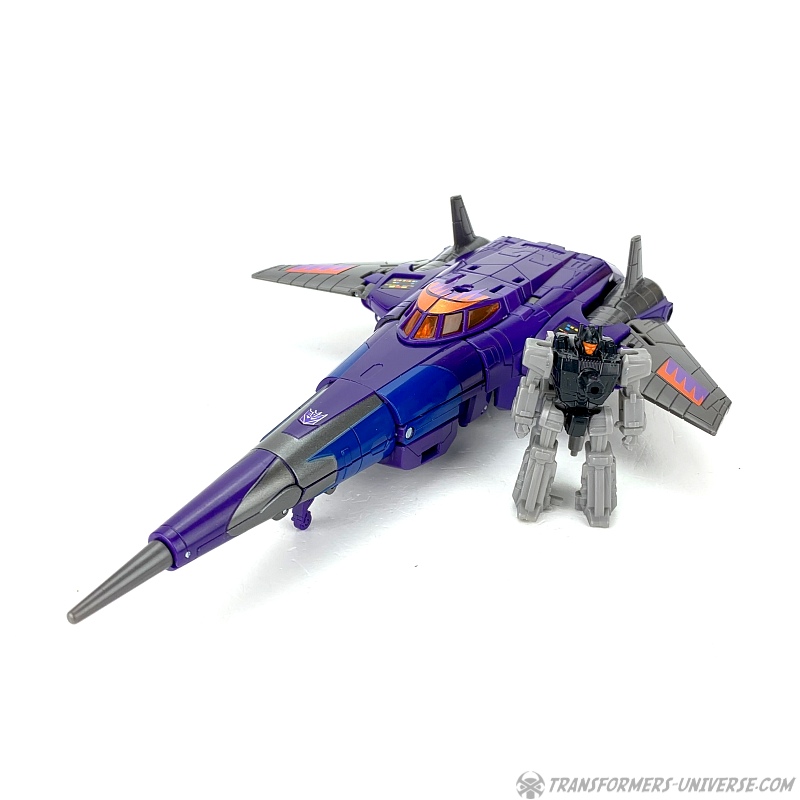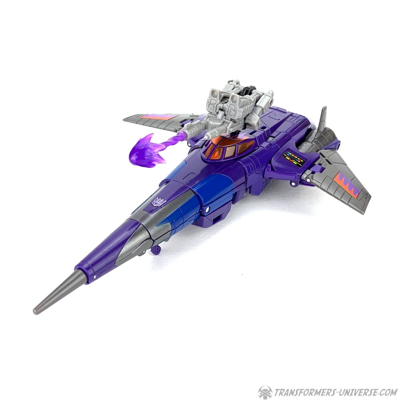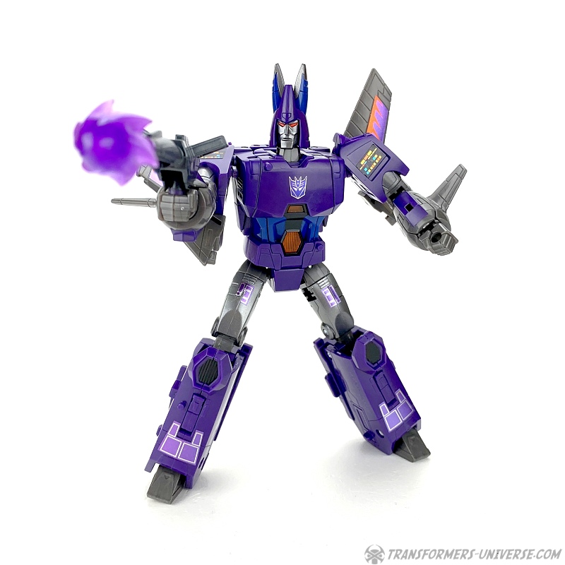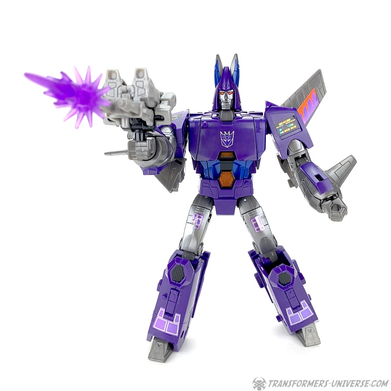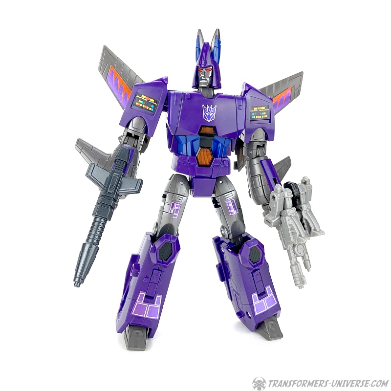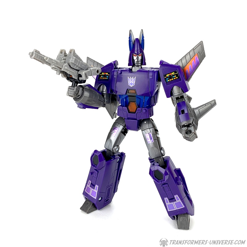 Bemerkungen: Fast jeder Generation 1 Charakter sah in Spielzeugform irgendwie anders aus als auf dem Bildschirm. Wir hatten extreme Beispiele wie Ironhide und Ratchet auf der einen und Charaktere wie Optimus Prime auf der anderen Seite, die auf dem Bildschirm lediglich etwas stromlinienförmiger aussahen als die Figur. Cyclonus liegt irgendwo zwischen diesen beiden Extremen. Seine Originalfigur war sicherlich klobiger als der Movie Charakter und hatte deutlich dunklere Farben, aber man konnte ihn klar erkennen.