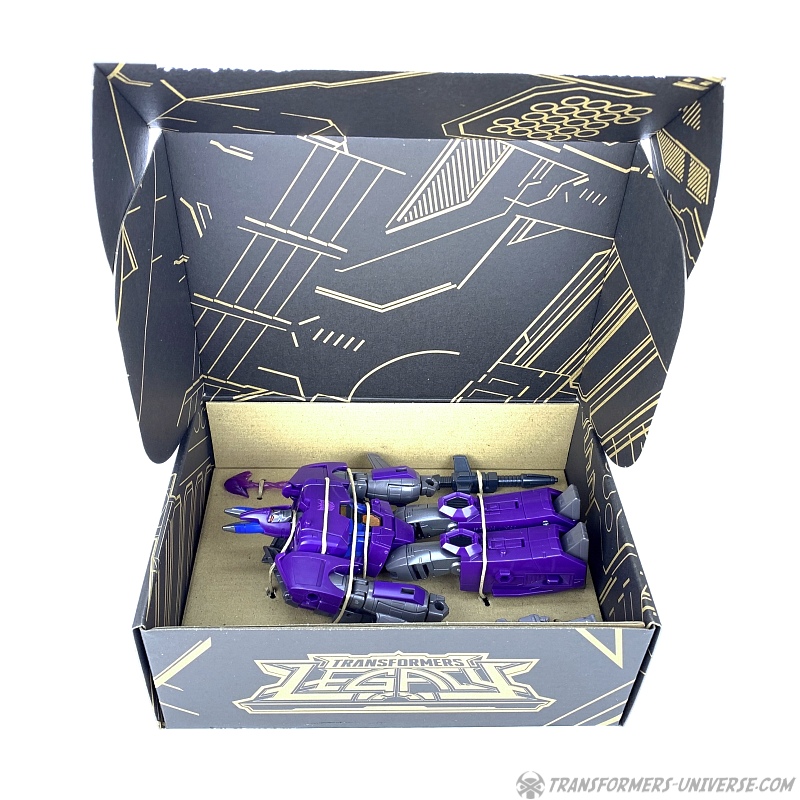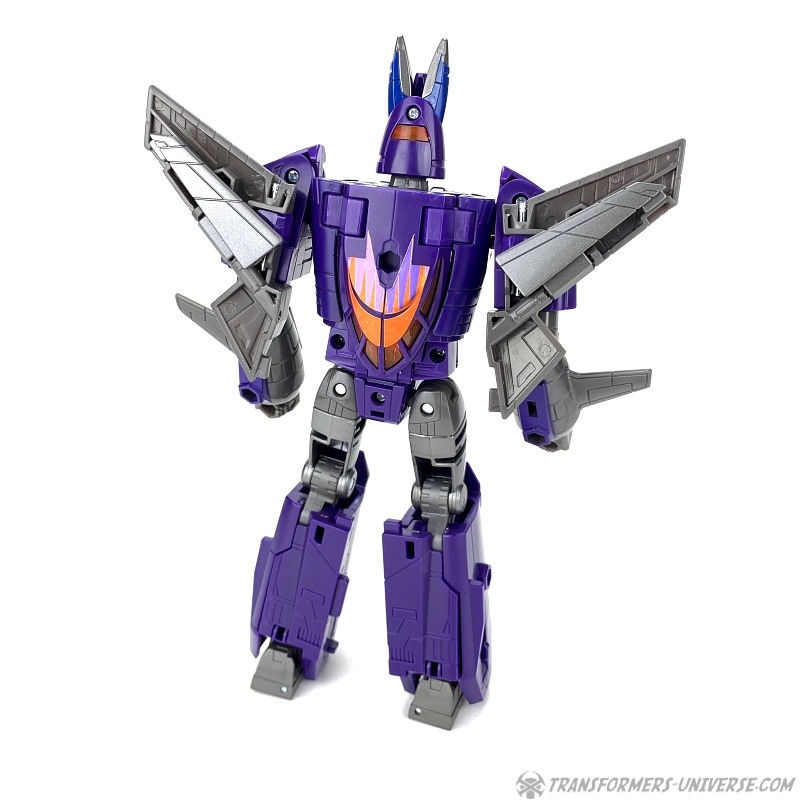 Unterschiede: Von den Farben mal abgesehen ist diese Figur natürlich genau der gleiche geniale Transformer wie Kingdom Cyclonus, insofern besprechen wir hier nur die Unterschiede. Generations Selects Cyclonus‘ Farben sind ein deutlich dunkleres, fast blaues Lila, beinahe 1:1 die Farbe der originalen 1986er Figur. Seine grauen Teile (Gesicht, Oberschenkel) sind ebenfalls dunkler und auch etwas glänzender als zuvor, außerdem sind jetzt auch Unterarme, Flügel und Füße grau, wo sie bei der Kingdom Version noch lila waren. Auch hier klar der originalen Figur nachempfunden.