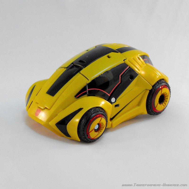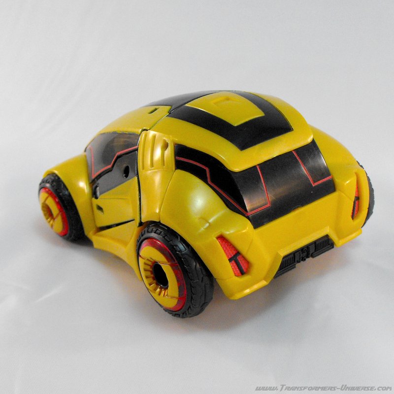Alternativmodus: Bei Bumblebees Fahrzeugmodus muss man im Hinterkopf haben, dass er den cybertronischen Modus des Gelblings darstellt, also nicht Tarnungszwecken dient, sondern einfach um von A nach B zu kommen. Insofern gibt es keine Fahrerkabine, keine Türen, nichts was man an einem menschlichen Auto finden dürfte. Trotzdem ist es vom Design her ganz gut gelungen, die grundlegende Form eines VW Käfers (oder vielmehr eines New Beetle) nachzubauen, aber eben im futuristischen Alien-Look.