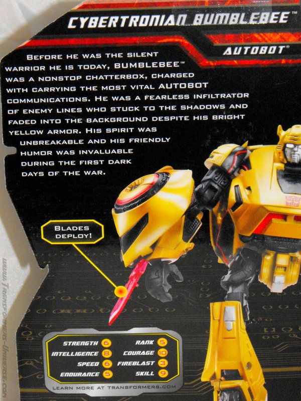Bevor er zu dem stillen Krieger wurde, der er heute ist, war Bumblebee ein Dauerschwätzer. Seine Aufgabe war es, die geheimsten Autobot Communiques zu transportieren. Furchtlos schlich er sich hinter die feindlichen Linien, hielt sich im Schatten und verschmolz mit dem Hintergrund, trotz seiner hellgelben Panzerung. Sein Wille war unerschütterlich und sein freundlicher Humor war während der ersten dunklen Tage des Krieges unschätzbar.