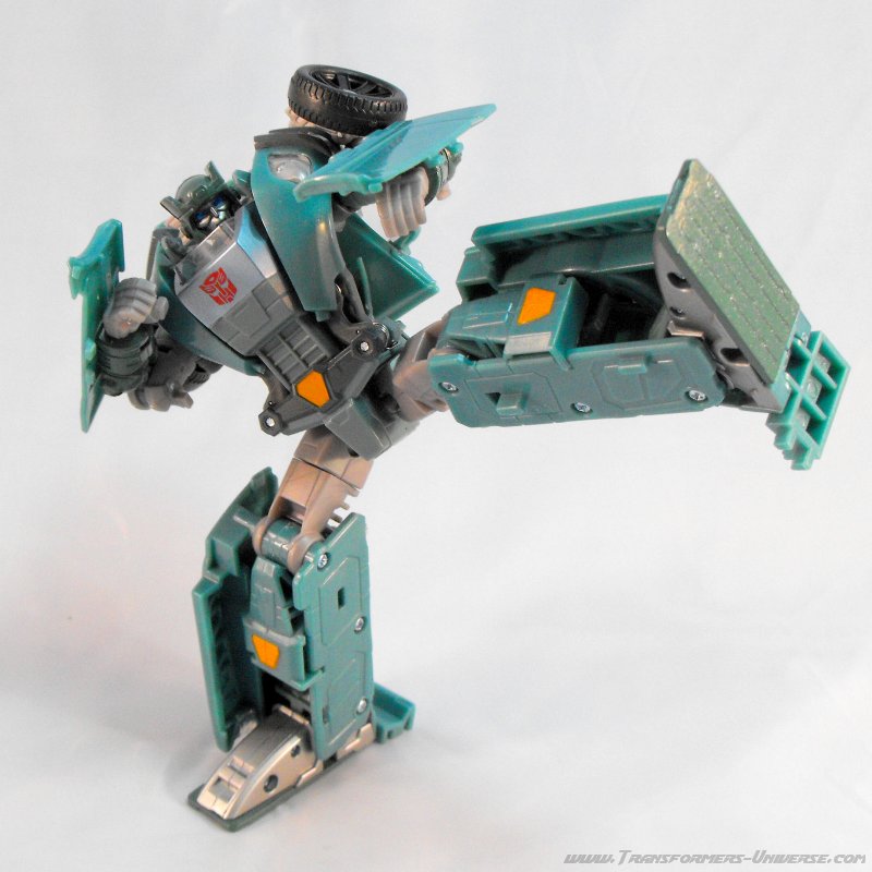 Trotz seiner recht einheitlichen Farbgebung sieht Kup sehr gut aus und hat eine Menge Details zu bieten. Speziell gefällt mir sein Torso, zusammengesetzt aus den vorderen Kotflügeln des Autos, einem gefälschten Kühlergrill als Bauch und der bereits genannten Windschutzscheibe. Fügt sich alles sehr schön zusammen. Die Beweglichkeit ist super, die einzige kleine Einschränkung sind die langen Panele an den Armen, die über die Hände hinausragen. Wäre schön gewesen, wenn man die nochmal hätte umklappen können oder ähnliches, ist aber kein großes Ding.