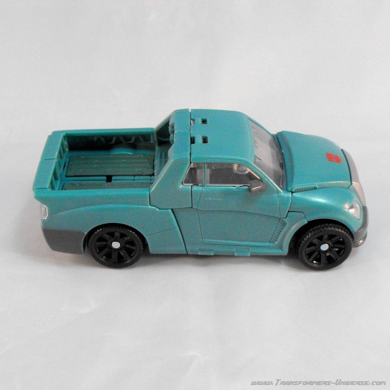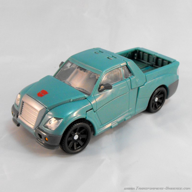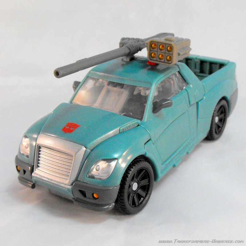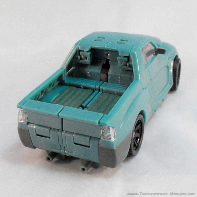Das genaue Modell, so es denn ein echtes ist, kenne ich jetzt nicht, aber der Pickup macht einen etwas altmodischen Eindruck; eben die Art Auto, die man in einer amerikanischen Kleinstadt erwarten würde. Das ausgeblichen wirkende Blau in Verbindung mit der irgendwie dreckig wirkenden Ladefläche hinten passt gut ins Gesamtbild. Anders als andere Pickup Truck Transformer hat Kup tatsächlich eine echte Ladefläche hinten, wo man auch was reintun könnte. Außerdem hat er oben auf dem Dach zwei Ports für die Anklick-Waffen, wo Kups Gewehr oder andere Waffen befestigt werden können. Das Gewehr kann ansonsten unter dem Auto befestigt werden, wo der Lauf zum zweiten Auspuff wird.