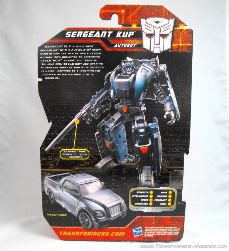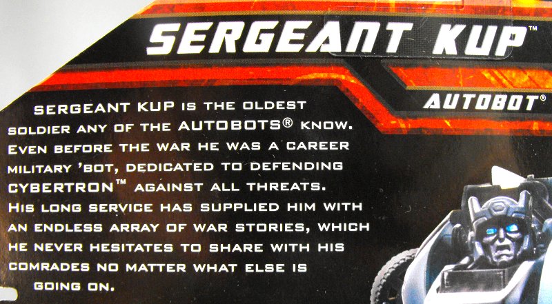 Sergeant Kup ist der älteste Soldat, den die Autobots kennen. Schon vor dem Krieg war er Berufssoldat und dem Schutz Cybertrons vor allen Gefahren verpflichtet. Seine lange Dienstzeit hat ihm ein endloses Repertoire an Kriegsgeschichten verschafft und er zögert nie, diese mit seinen Kameraden zu teilen, egal was sonst gerade los ist.