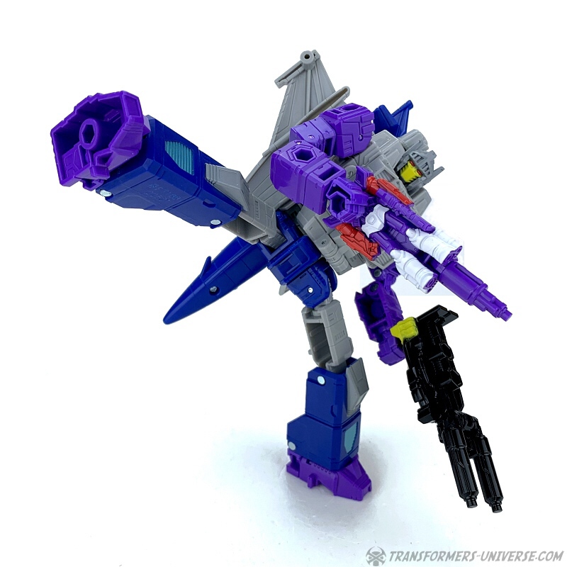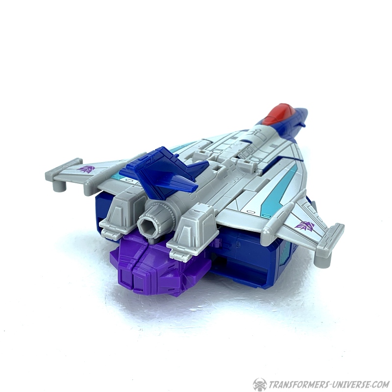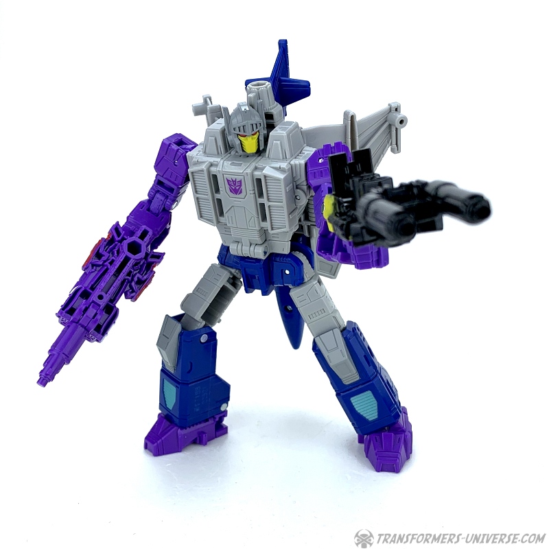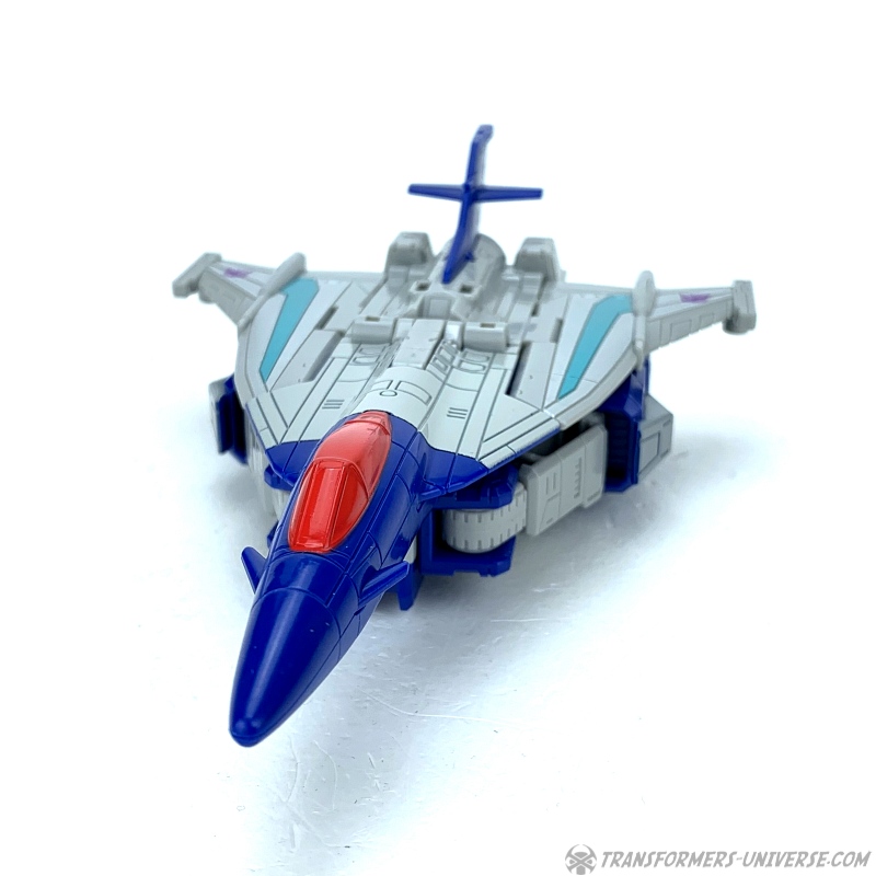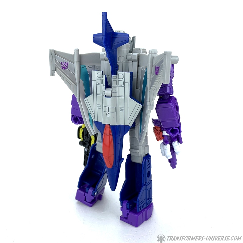 Nun ist Needlenose in beiden Inkarnationen die Art von Jet Transformer, der fast den kompletten Jetmodus auf dem Rücken trägt, allerdings macht er das besser, als viele andere Figuren mit diesem Design. Das Cockpit hängt zwar relativ weit zwischen den Beinen runter, behindert die Beinbeweglichkeit aber nicht. Die Flügel können nach hinten klappen, so dass er die Arme frei schwingen kann. Die Beweglichkeit ist so gut, wie man es von einer Legacy Figur erwartet, somit ist von drehbaren Handgelenken bis beweglichen Füßen alles dabei.