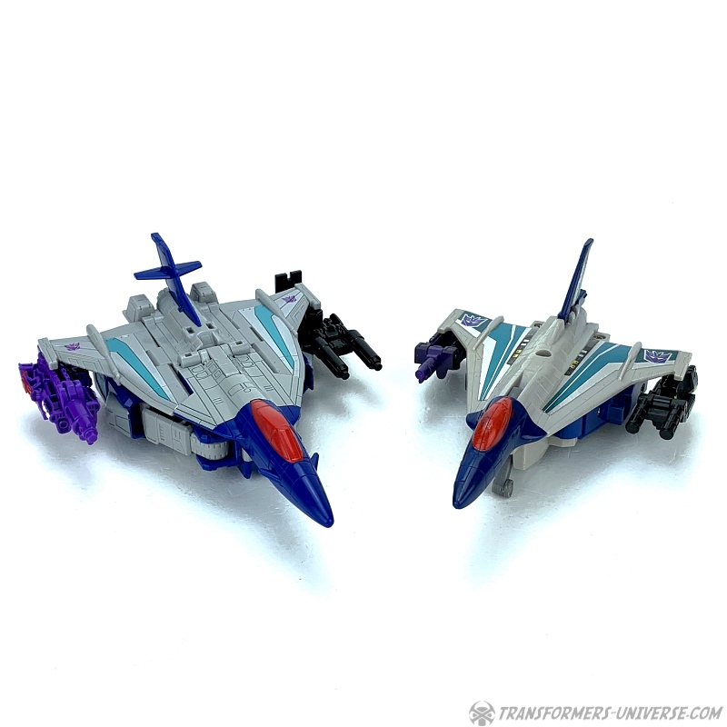 Alternativmodus: Wie schon sein G1 Vorgänger verwandelt sich auch Legacy Needlenose in einen F-16XL Fighting Falcon Kampfjet. Und wie schon im Robotermodus ist er auch hier mit dem Original fast identisch, nur größer. Die Transformation ist etwas komplexer als damals in 1988, aber nicht wirklich schwierig. Stellt man die beiden Versionen nebeneinander, kann man schon mal kurz überlegen, welche jetzt nicht moderne und welche der Klassiker ist (von den Abnutzungserscheinungen an meinem G1 Needlenose mal abgesehen).