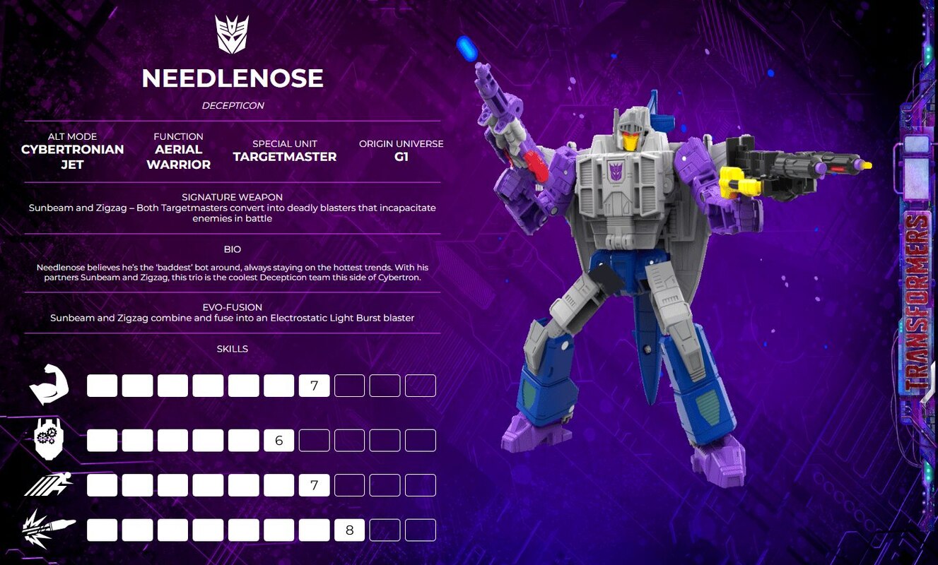 Needlenose glaubt, er sei der coolste Bot von allen, immer an den heißen Trends dran. Mit seinen Partnern Sunbeam und Zigzag zusammen ist dieses Trio das coolste Decepticon Team diesseits von Cybertron.