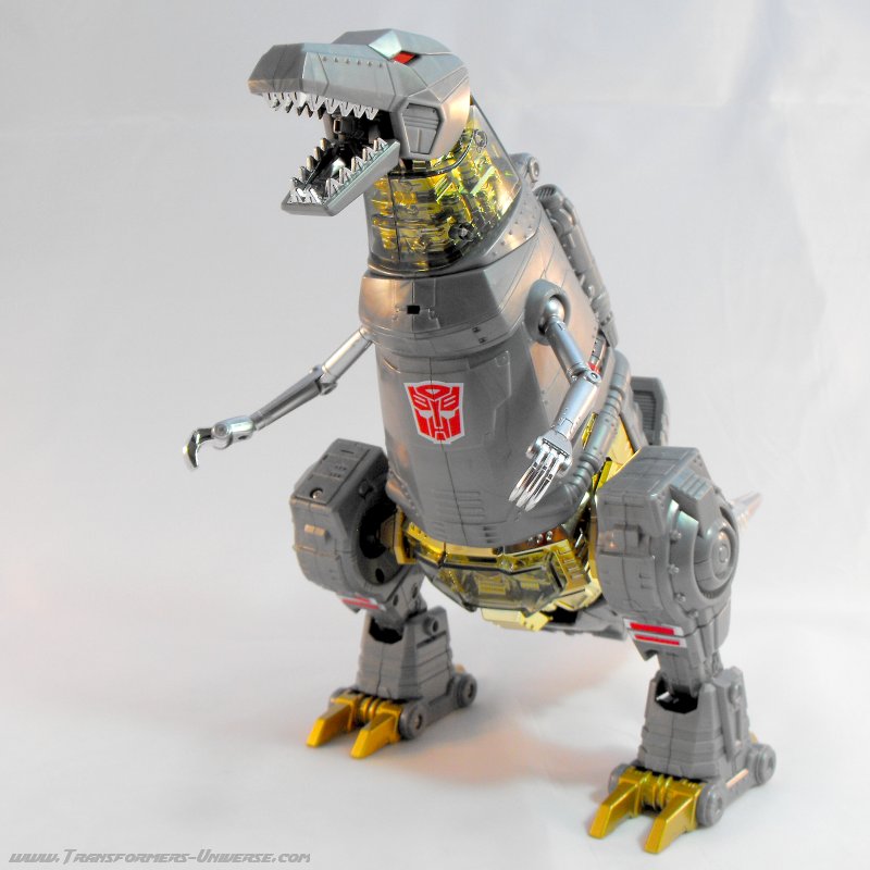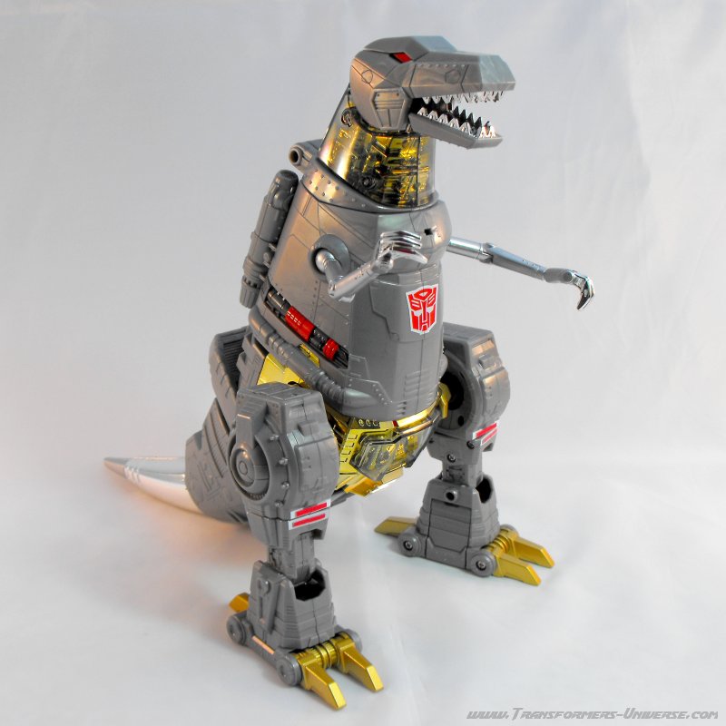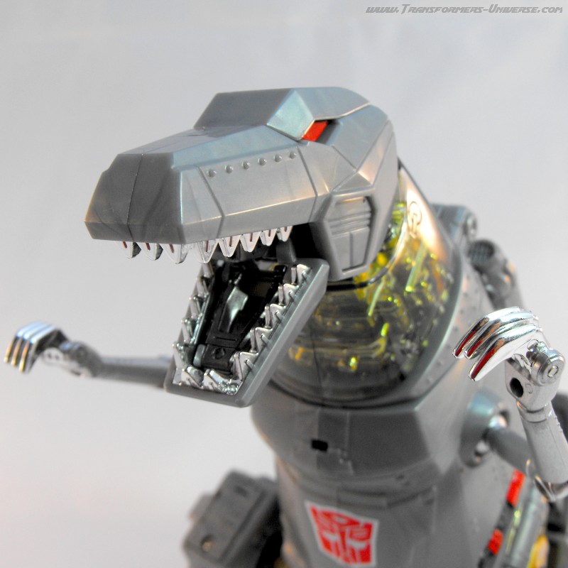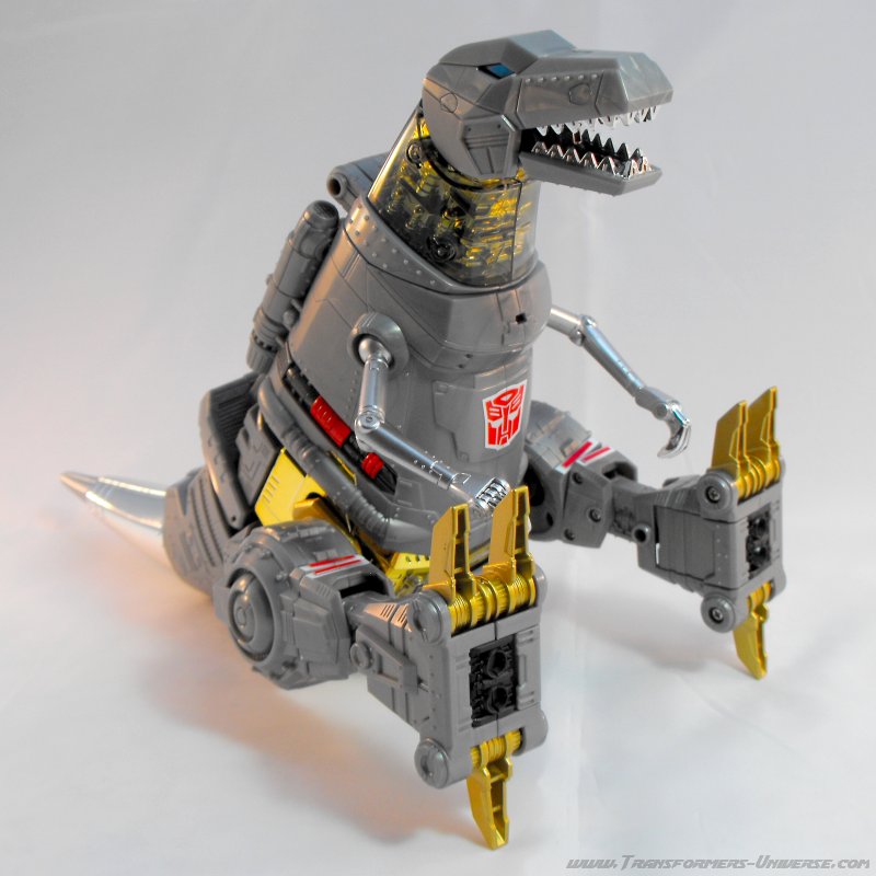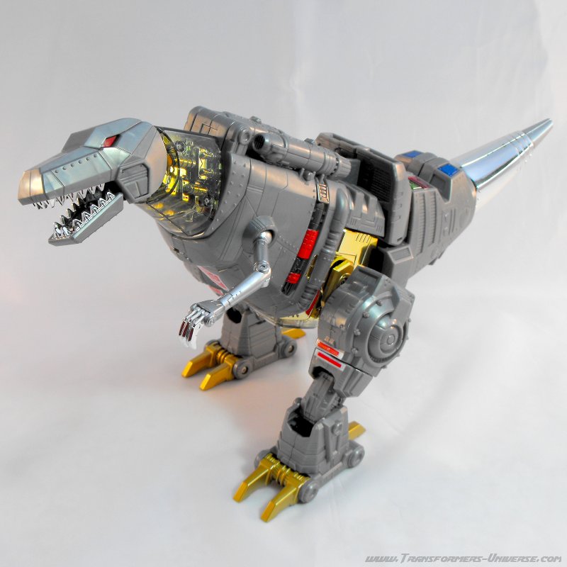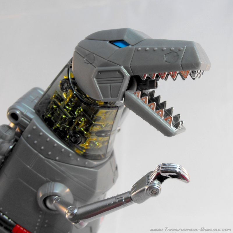 Alternativmodus: Um seinen hervorragenden Robotermodus zu vervollständigen verwandelt sich Grimlock in ein lange überfälliges Update seines originalen T-Rex Modus. Er wird immer noch zu dem archaischen, Schwanz-hinter-sich-herziehenden Urzeitvieh anstatt der „modernen“ Version, aber das ist Teil seines Charms. Auch hier ist er natürlich größtenteils grau und präsentiert weniger Farbe als im Robotermodus. Man findet silbernes Chrom am Schwanz, den Armen und den Zähnen, während seine Hüfte golden verchromt ist. Hier also keine Beschwerden.