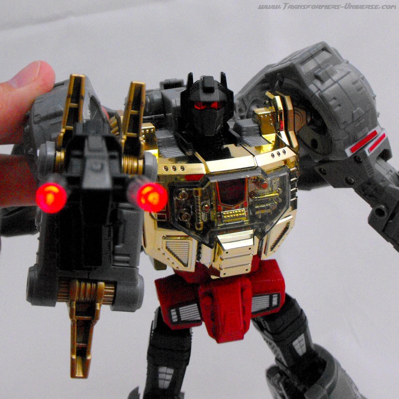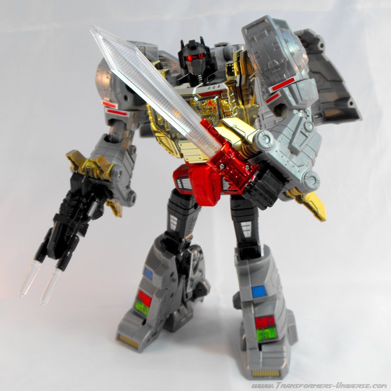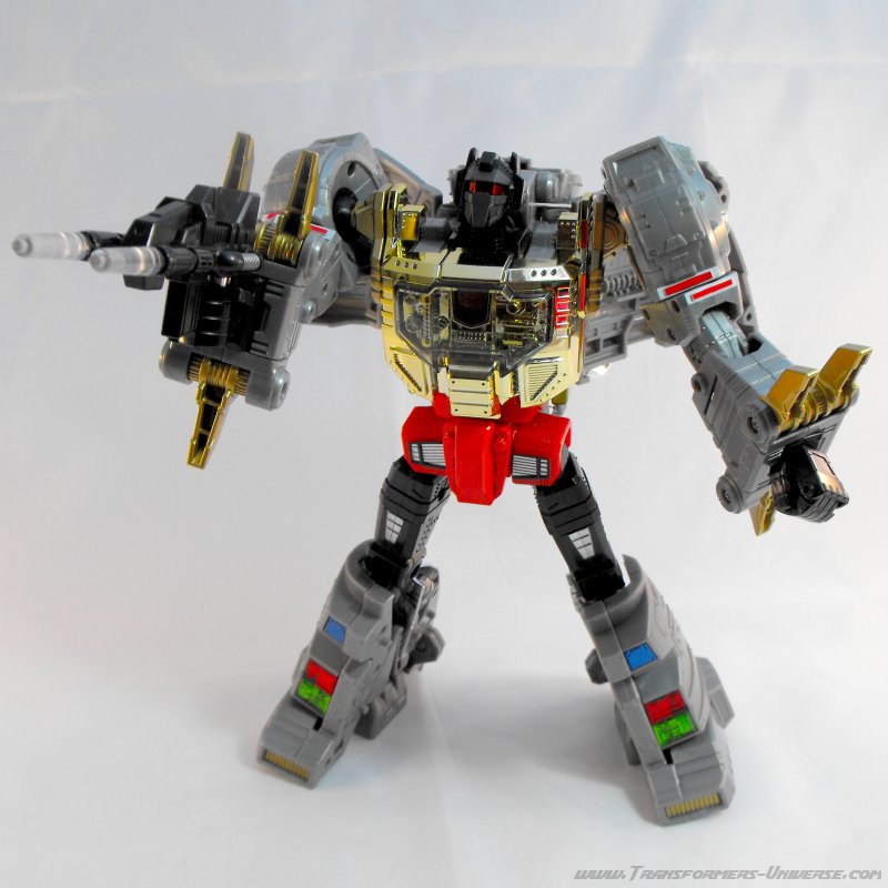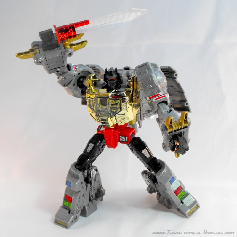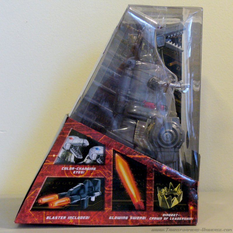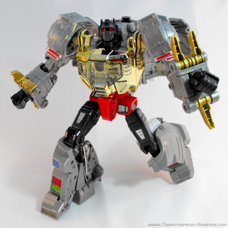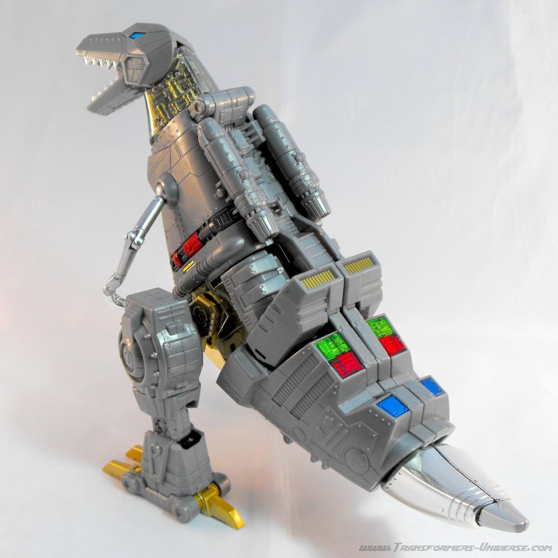 Alternativmodus: Um seinen hervorragenden Robotermodus zu vervollständigen verwandelt sich Grimlock in ein lange überfälliges Update seines originalen T-Rex Modus. Er wird immer noch zu dem archaischen, Schwanz-hinter-sich-herziehenden Urzeitvieh anstatt der „modernen“ Version, aber das ist Teil seines Charms. Auch hier ist er natürlich größtenteils grau und präsentiert weniger Farbe als im Robotermodus. Man findet silbernes Chrom am Schwanz, den Armen und den Zähnen, während seine Hüfte golden verchromt ist. Hier also keine Beschwerden.
