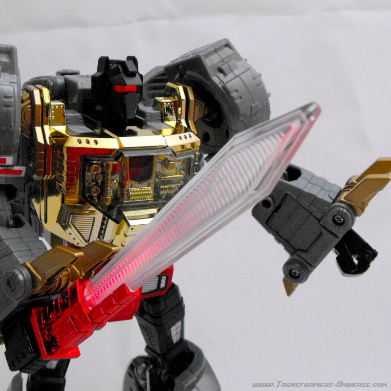 Was Zubehör und Gimmicks angeht, so hat die Hasbro Version hier auf den größten Teil nutzlosen Mülls verzichtet, den man eh nur verliert. Er hat nur sein Energo-Schwert dabei, seinen doppelläufigen Blaster, sowie die Dinobot Krone. Die Krone war das Accessoire, dass die Leute bei der Takara Version am meisten haben wollten, insofern war es nett von Hasbro, es hier beizulegen. Die Krone sieht sehr gut aus. Ich weiß noch nicht, ob ich Grimlock mit oder ohne in meine Vitrine stelle, aber sie ist vorbildgetreu und gut gemacht. Man kann beide Waffen in Grimlocks Hände geben, aber nur in der rechten Hand ist das Gimmick drin. Ein Knopf hinten an der Schulter aktiviert das Licht in der Hand, das die entsprechende Waffe zum Leuchten bringt. Und es ist ein helles Licht, also bitte nicht direkt reinschauen, Kinder! Sein letztes Gimmick sind seine Augen. Hier kann man die Farbe wechseln, um entweder das Original-Spielzeug (blau) oder die Cartoonfigur (rot) zu ehren. Sehr schön gemacht von den Designern.
