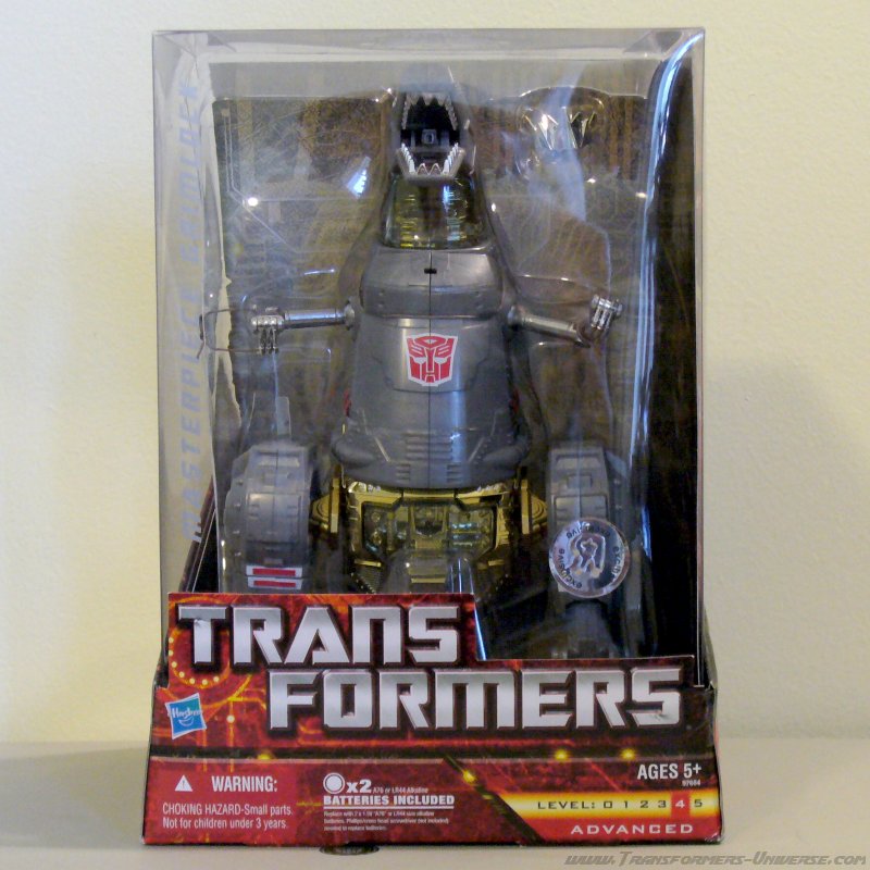 Robotermodus: Masterpiece Grimlock ist der Grimlock unserer Träume. Er ist ein Abbild von Kraft mit seiner breiten Brust und den mächtigen Armen. Seine Farbgebung entspricht der Originalfigur aus den alten Tagen von G1. Sein Körper ist größtenteils grau mit einer roten Hüfte und einer goldverchromten Brust. Auf Armen und Beinen, sowie im Schritt finden sich kleine, farbige Paneele, die den Stickern der Originalfigur entsprechen. Eine Abweichung vom Originaltoy ist allerdings das Autobot Symbol auf der Brust. Die G1-Figur hatte hier einen Sticker, der nach der Transformation beim Dino auf der Hüfte saß. Bei der Masterpiece Version jedoch ist es ein separates Paneel, das hochklappt wenn die Brust eingeklickt wird, ähnlich wie bei den Headmasters. Die Farben sind sehr schön und vorbildakkurat, Mission also erfüllt.