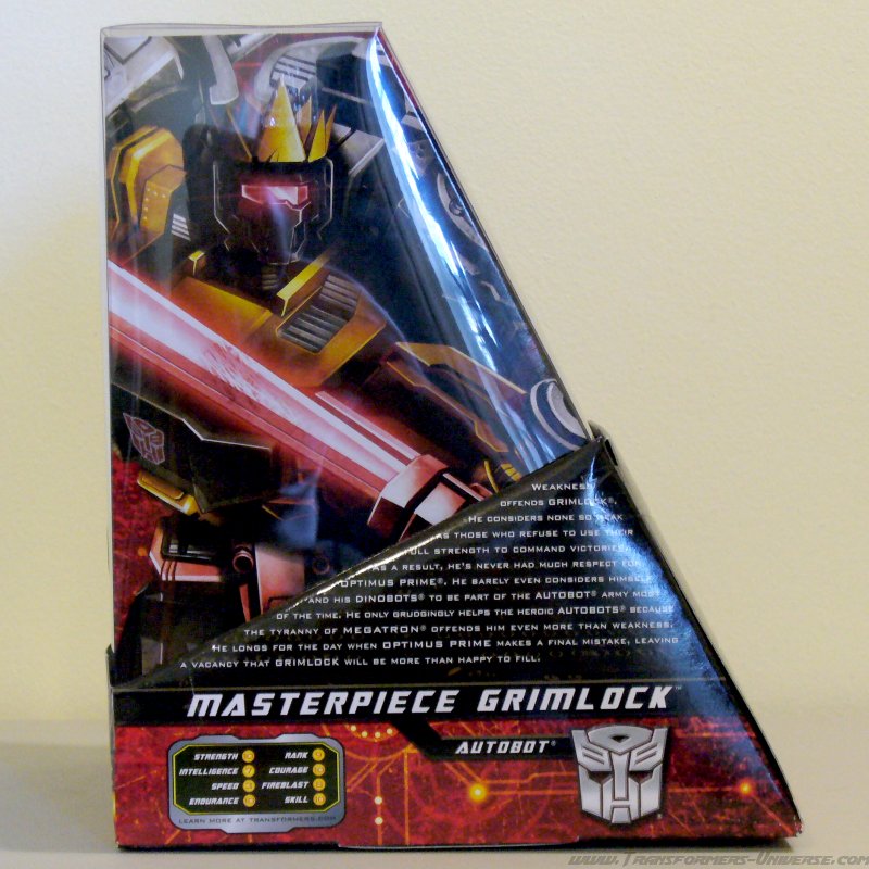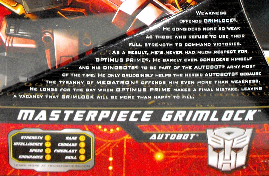 Grimlock verachtet Schwäche. Und besonders diejenigen, die nicht ihre volle Kraft einsetzen, um den Sieg zu erringen. Deswegen hatte er auch nie großen Respekt vor Optimus Prime. Er betrachtet sich und seine Dinobots kaum als Teil der Autobot Armee. Nur widerwillig hilft er den Autobots, weil er Megatrons Tyrannei noch mehr verachtet als Schwäche. Er wartet auf den Tag wo Optimus Prime endlich einen tödlichen Fehler machen wird. Grimlock wird dann mit Vergnügen seinen Platz einnehmen.