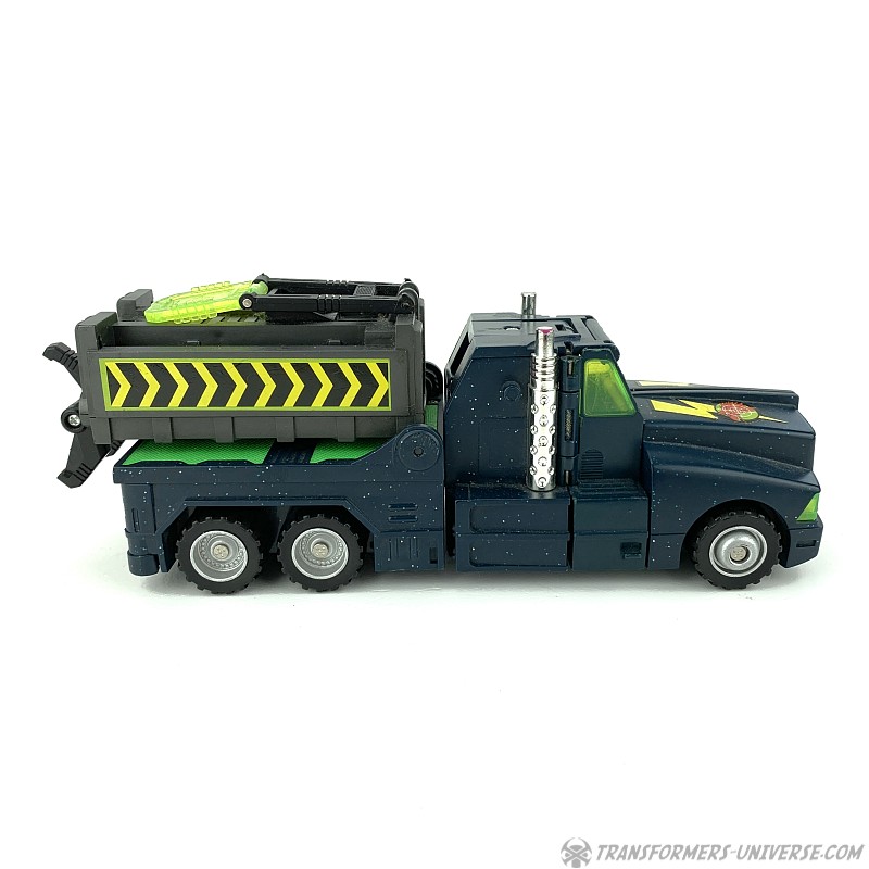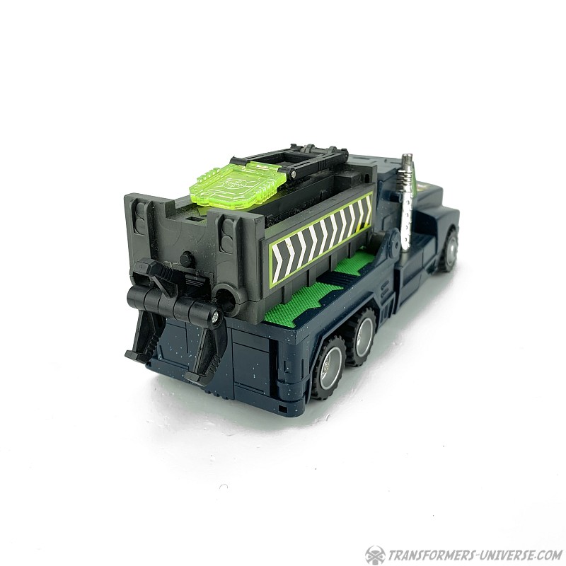 Fahrzeugmodus: Clench verwandelt sich in einen großen Abschleppwagen mit Greifklaue hinten dran. Glücklicherweise sind alle pinken Teile des Robotermodus hier weggeklappt und nicht sichtbar. Der Truck als solcher ist jetzt nichts außergewöhnliches, sieht aber recht realistisch aus und bietet mit der ausfahrbaren Klaue hinten auch etwas Spielspaß. Deshalb alles in allem ein anständiger Fahrzeugmodus.
