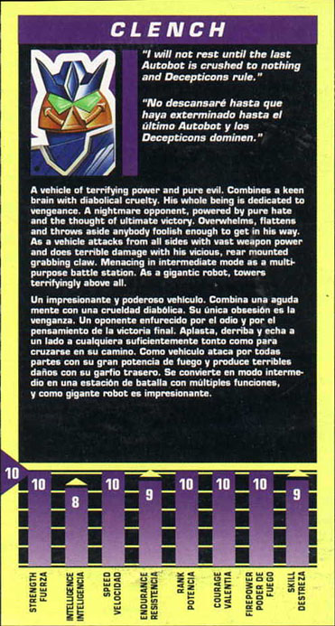 Bemerkungen: Clench ist eine Figur aus jenen Tagen, wo die Generation 1 in Amerika schon vorbei war, in Europa aber noch weiterlief. Er kam, soweit ich weiß, nie in irgendeinem Comic oder Cartoon vor, weder in Japan noch in der westlichen Welt. Die Figur selbst (die für die Generation 2 unter dem Namen Colossus neu aufgelegt wurde) ist jedoch, wenn auch nicht spektakulär, so doch erstaunlich innovativ und einfach solide. Ich würde jetzt nicht hingehen und ihn eine klare Empfehlung nennen, aber wenn man ihn irgendwo billig kriegen kann gibt es eigentlich keinen Grund, ihn sich nicht für seine Sammlung zu holen.