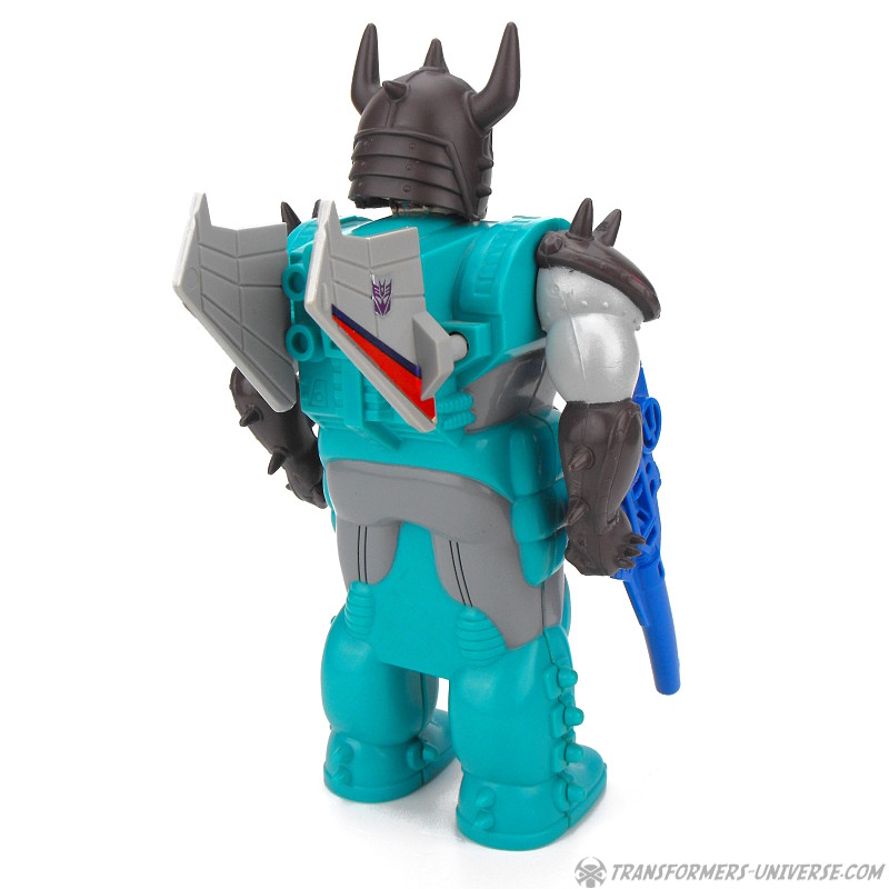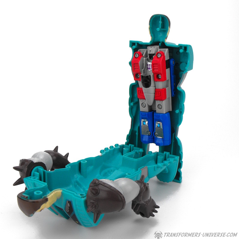 Roboter Modus: Starscreams Robotermodus hätte eine gute Version des Charakters werden können. Er ist weniger zerbrechlich und einfach ganzheitlicher als das Original, das hätte was werden können. Leider haben die Entwickler wenig Liebe in das Design gesteckt. Die Arme sind beweglich, aber das war's, der Rest ist eine Statue. Alle Schrauben schauen vorne raus und sind sichtbar. Nimmt man seine geringe Größe dazu, bedingt durch das Pretender Gimmick, dann hat man einen Starscream der zwar nach Starscream aussieht, aber ansonsten enttäuscht. Seine Pretender Hülle ist Standard, ein gerüsteter Krieger mit abnehmbaren Helm und außer in den Armen unbeweglich. Um die Hülle interessanter zu machen kann man ihr Starscreams Flügel auf den Rücken schnallen und aus den Heckflügeln des Jets so eine Art Keule bauen.