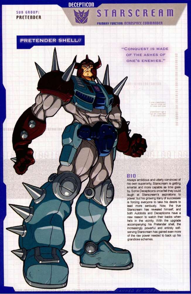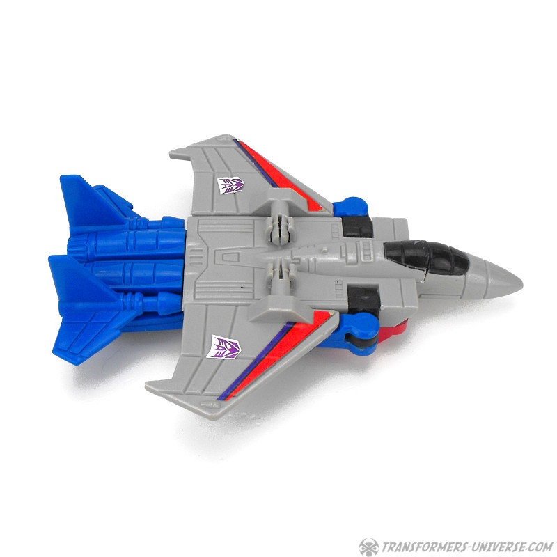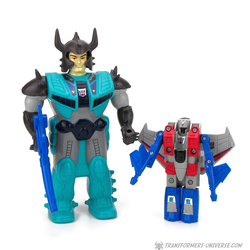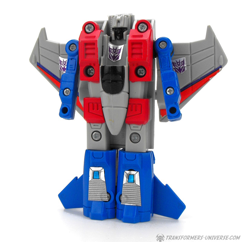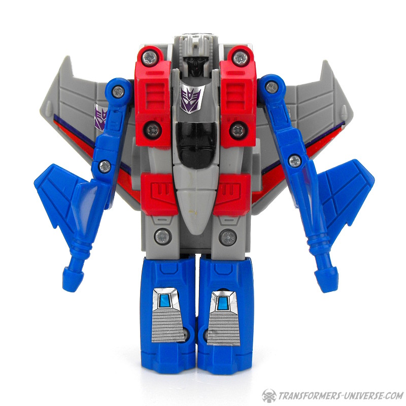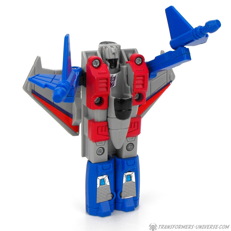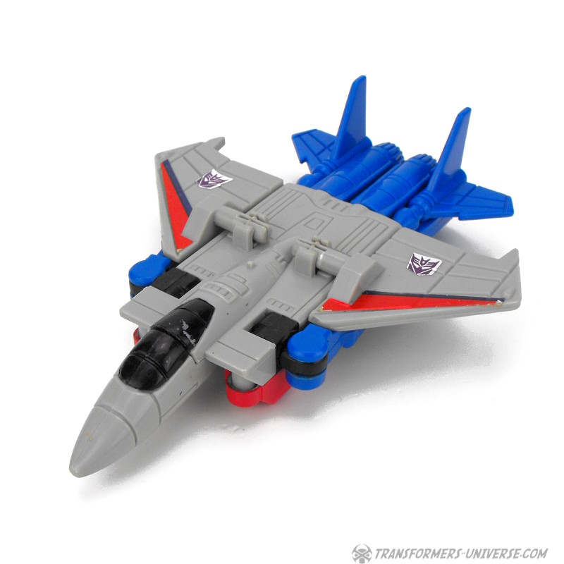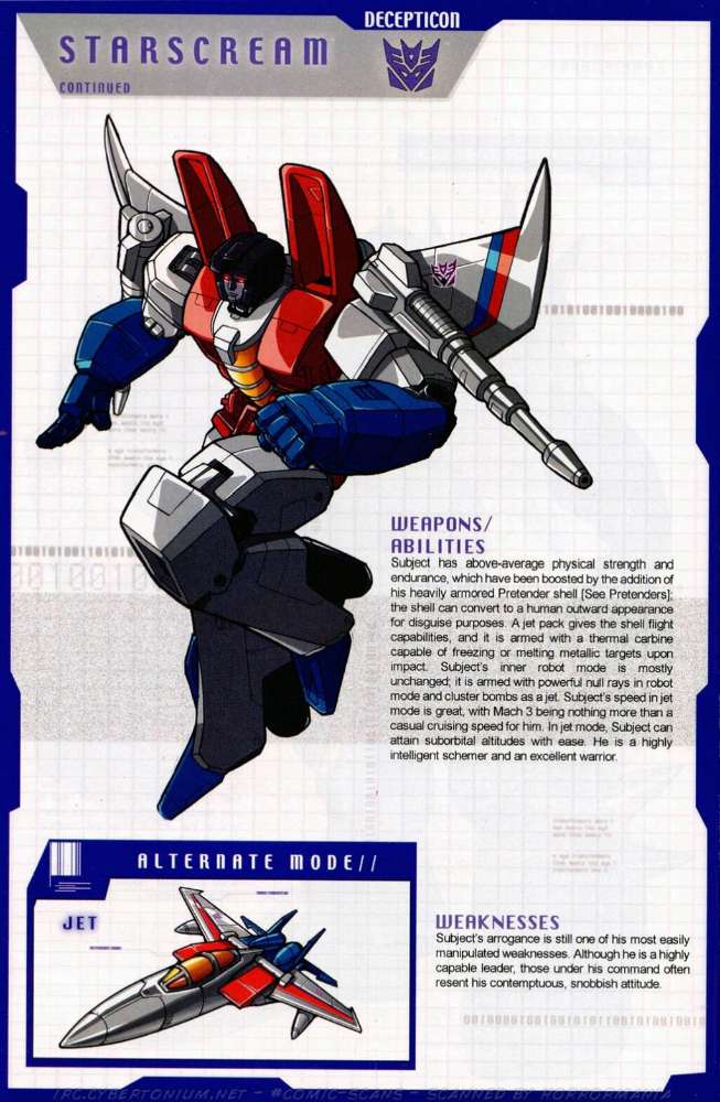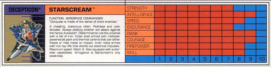 Ein betrügender, verräterischer Schurke, ruchlos und kaltblütig. Ständig schmiedet er neue böse Angriffspläne gegen die heldenhaften Autobots. Er ist entschlossen das Universum mit eiserner Faust zu regieren. Seine äußere Hülle ist mit einem Raketenrucksack bestückt und mit einem Thermalgewehr bewaffnet, welches Metall schmelzen oder gefrieren kann. Der innere Roboter trägt ein Nullstrahlengewehr, welches elektrische Impulse kurzschließt. Höchstgeschwindigkeit des Jets ist Mach 3 und er kann suborbitale Höhen erreichen. Starscreams einzige Schwäche ist seine Arroganz.