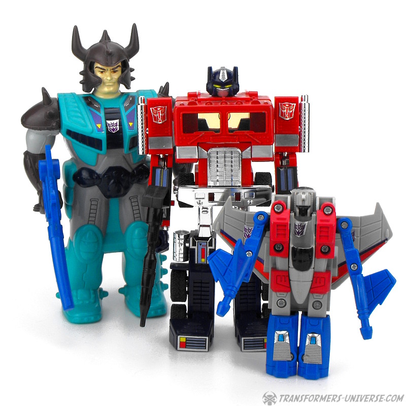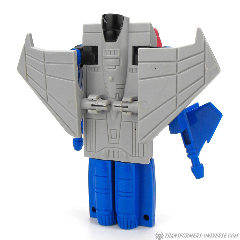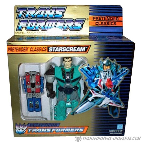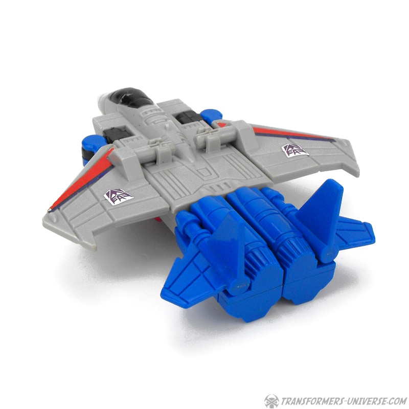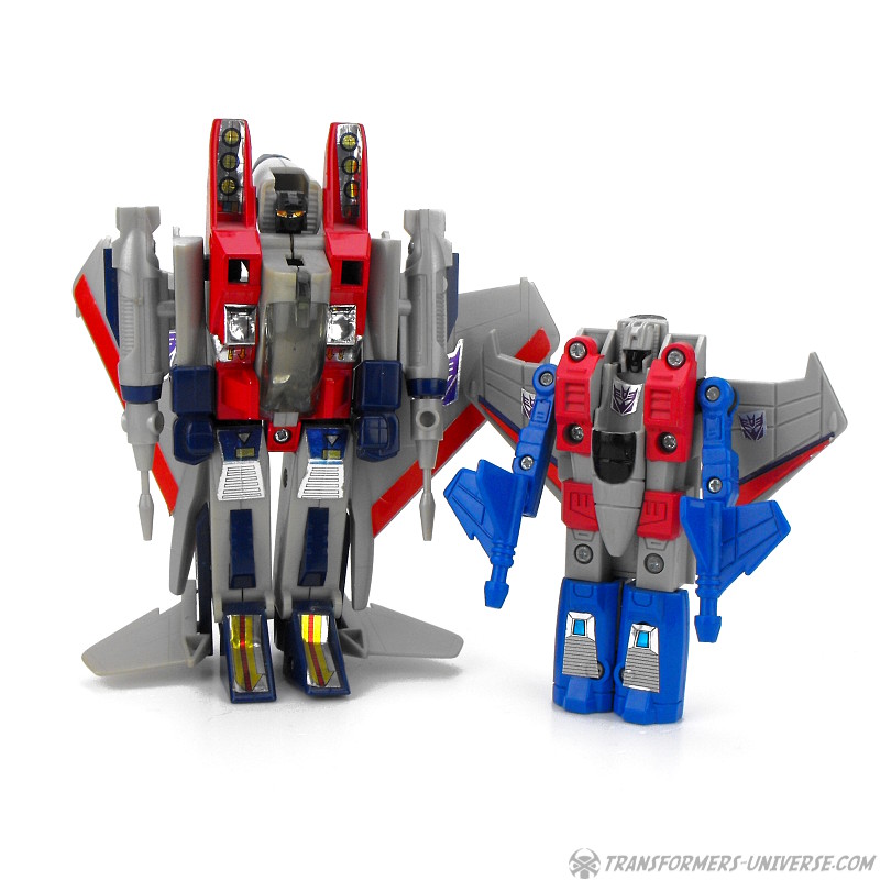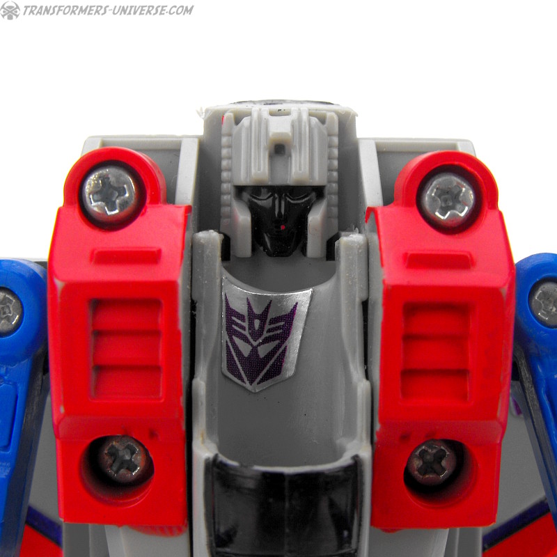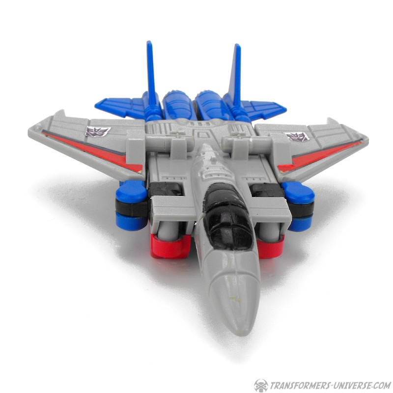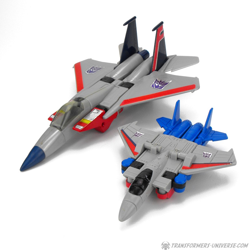 Ein betrügender, verräterischer Schurke, ruchlos und kaltblütig. Ständig schmiedet er neue böse Angriffspläne gegen die heldenhaften Autobots. Er ist entschlossen das Universum mit eiserner Faust zu regieren. Seine äußere Hülle ist mit einem Raketenrucksack bestückt und mit einem Thermalgewehr bewaffnet, welches Metall schmelzen oder gefrieren kann. Der innere Roboter trägt ein Nullstrahlengewehr, welches elektrische Impulse kurzschließt. Höchstgeschwindigkeit des Jets ist Mach 3 und er kann suborbitale Höhen erreichen. Starscreams einzige Schwäche ist seine Arroganz.