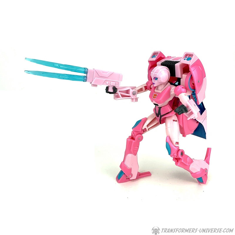 Vom Look her ist das ganz klar Arcee; ich würde sogar sagen: aber SOWAS von Arcee. Lippenstift und Mascara mit inbegriffen. Eine tolle Abbildung des Cartoon Charakters. Als Waffe trägt sie den gleichen Doppelblaster wie in der Serie (nennt sich wohl „Dual Energon Lazers“) und zwei mitgelieferte Blast-Effekte runden das ab. Die beiden Blast Effekte kann Arcee auch in der Hand halten, um an die Energieschwerter zu erinnern, die zahlreiche Versionen von Arcee dabei hatten.