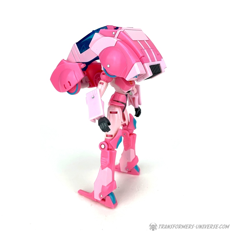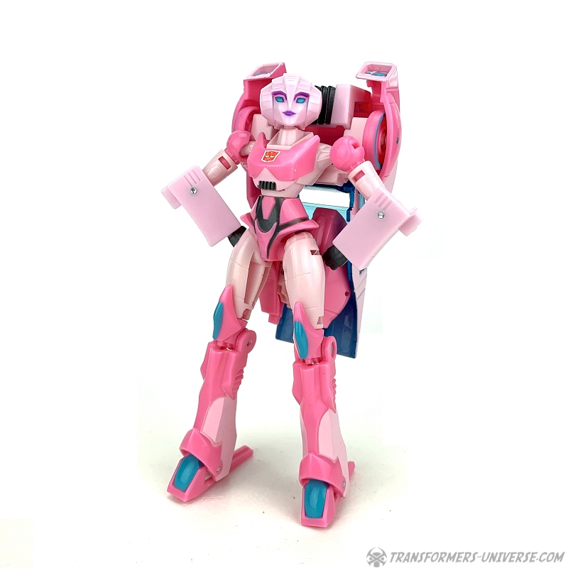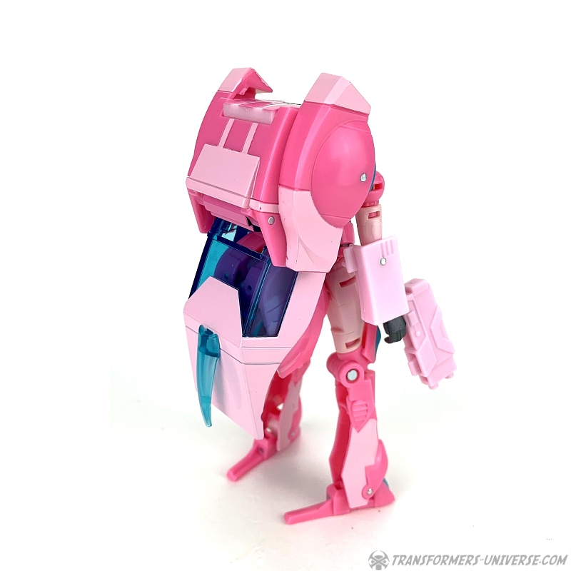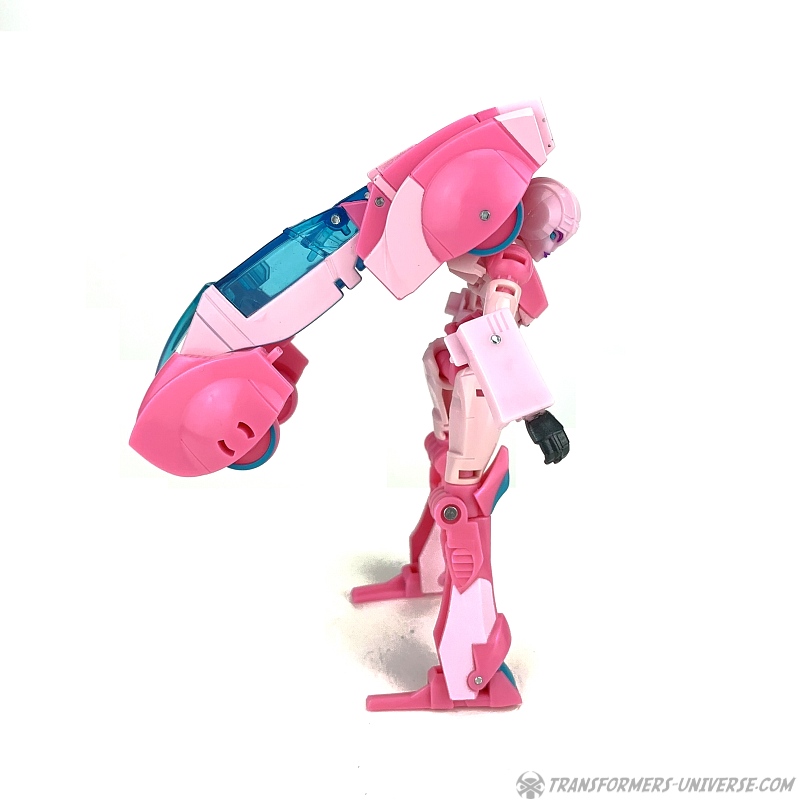 Arcee ist ein sog. Shell-Former, was bedeutet ihr Fahrzeugmodus ist fast komplett separat vom Roboter und hängt als Rucksack am Rücken (wenn auch etwas zusammengefaltet). Vom eigentlichen Roboter werden lediglich die Unterarme Teil des Autochassis, der restliche Roboter faltet sich einfach nur darin zusammen. Trotzdem sie aber einen so großen Rucksack hat, hat Arcee weder Gleichgewichtsprobleme (dank sehr langer Fersen) und es behindert sie auch nicht beim Posieren. Der Rücksack ist auf einem Gelenk, man kann ihn also bei extravaganteren Posten von den Beinen wegkippen. Sehr schön gemacht, muss ich sagen.