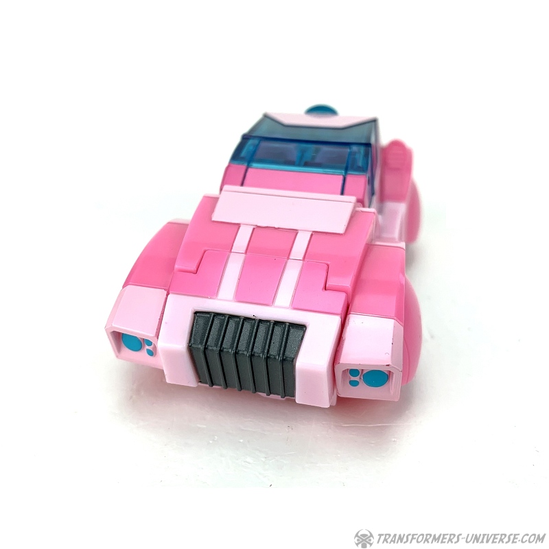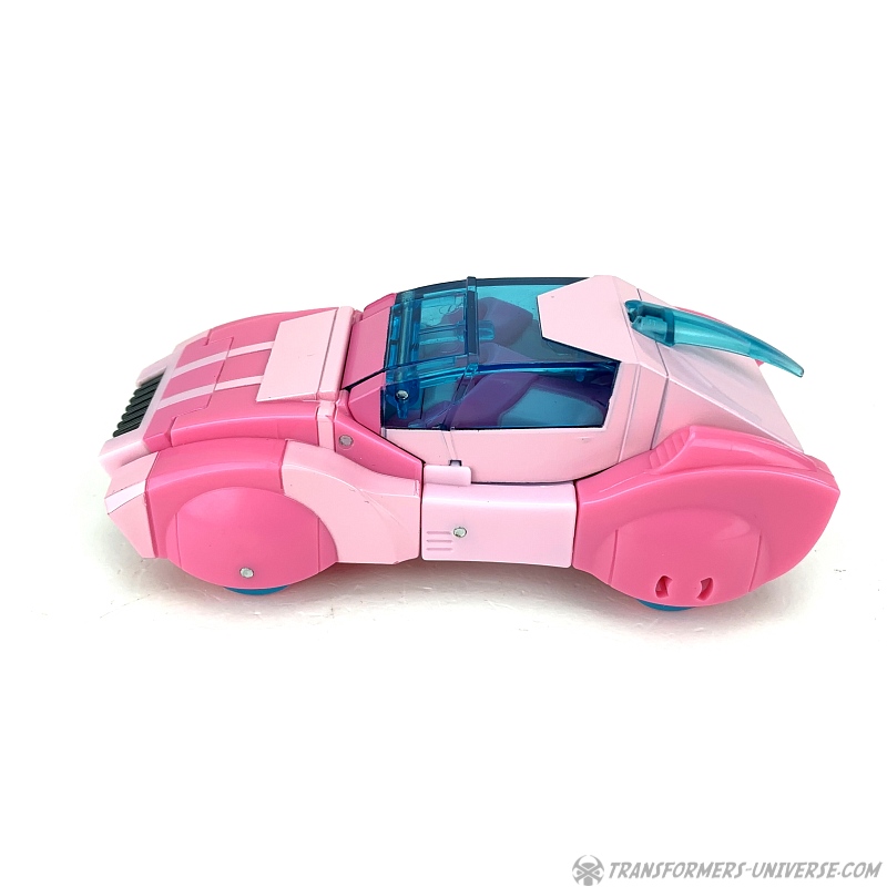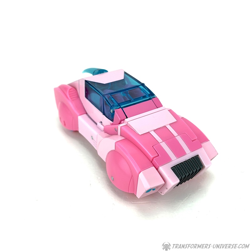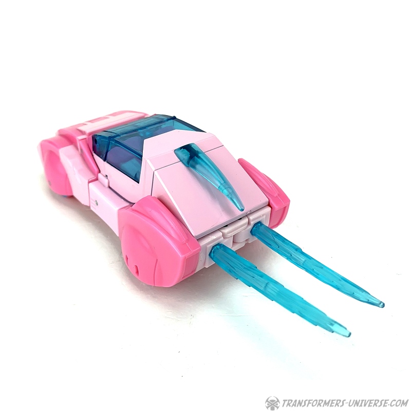 Alternativmodus: Wie schon oben erwähnt ist Arcee durch und durch ein Shell-Former. Sie transformiert weniger als dass sie einfach ihre Beine einklappt und sich die Fahrzeughülle vom Rücken überstülpt, fertig. Das resultierende Auto ist natürlich von Arcees G1 Automodus inspiriert, aber mit einer etwas kantigeren Ästhetik, wie sie halt Cyberverse eingeführt hat. Guckt man sich das Auto von unten an, dann sieht man praktisch den gesamten Roboter. Aber es funktioniert, somit für mich okay, wollte es nur für die Leute erwähnen, die Shell-Former nicht mögen. Arcees Effekt-Teile können hinten am Auto als Nachbrennerflammen angebracht werden und die Waffe kann in der Hülle verstaut werden.