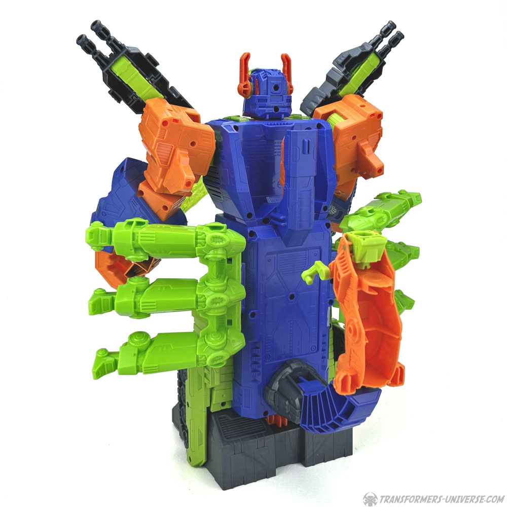Jetzt kommen wir zu dem spaßigen interaktiven Teil. Beide Geschütze von Scorponoks Schultern kann man wie gesagt abnehmen, dann können sie von kleineren Figuren genutzt werden. Sie können sie am Rücken oder an den Armen anbringen oder oben auf ihren Fahrzeugmodi. Alternativ kann man sie aufklappen und an den Beinen, den Schultern, oder der aufgeklappten Brust von Scorponok anbringen, wo die kleineren Figuren dann als Kanoniere dienen können.