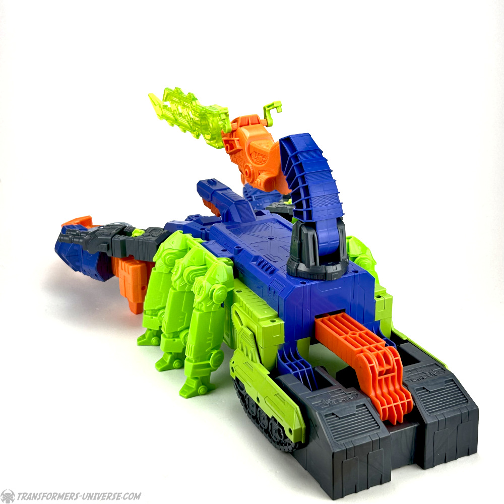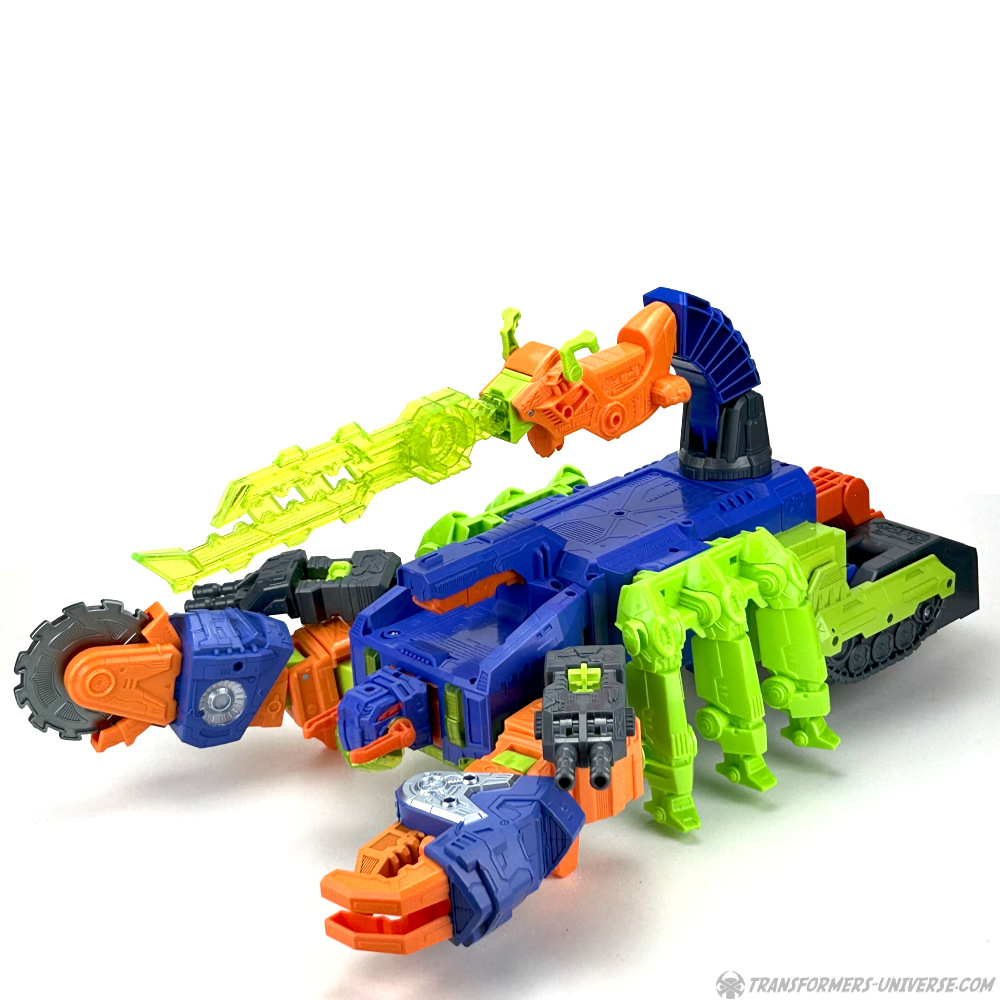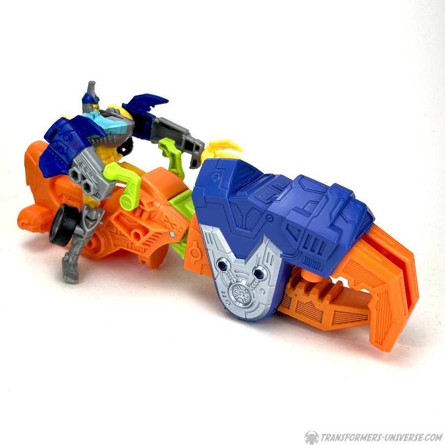 Und dann ist da noch das Mittelstück seines Schwanzes, welches man auch abnehmen kann, damit es zu einem Motorrad wird. Nun ja, einem halben Motorrad, denn man muss entweder die Klaue, die Säge, oder das Schwert vorne anbringen, um ein ganzes zu kriegen. Das ist total verrückt und durchgeknallt und ich liebe es. Erinnert mich an dieses komische Laser-Cycle aus dem Kopf von Beast Wars 2 Tako Tank, ein weiteres verrücktes, durchgeknalltes Toy. Man kann auch eines der Doppelgeschütze vorne am Motorrad anbringen, allerdings funktioniert das nicht so gut, weil es dann nach vorne kippt.