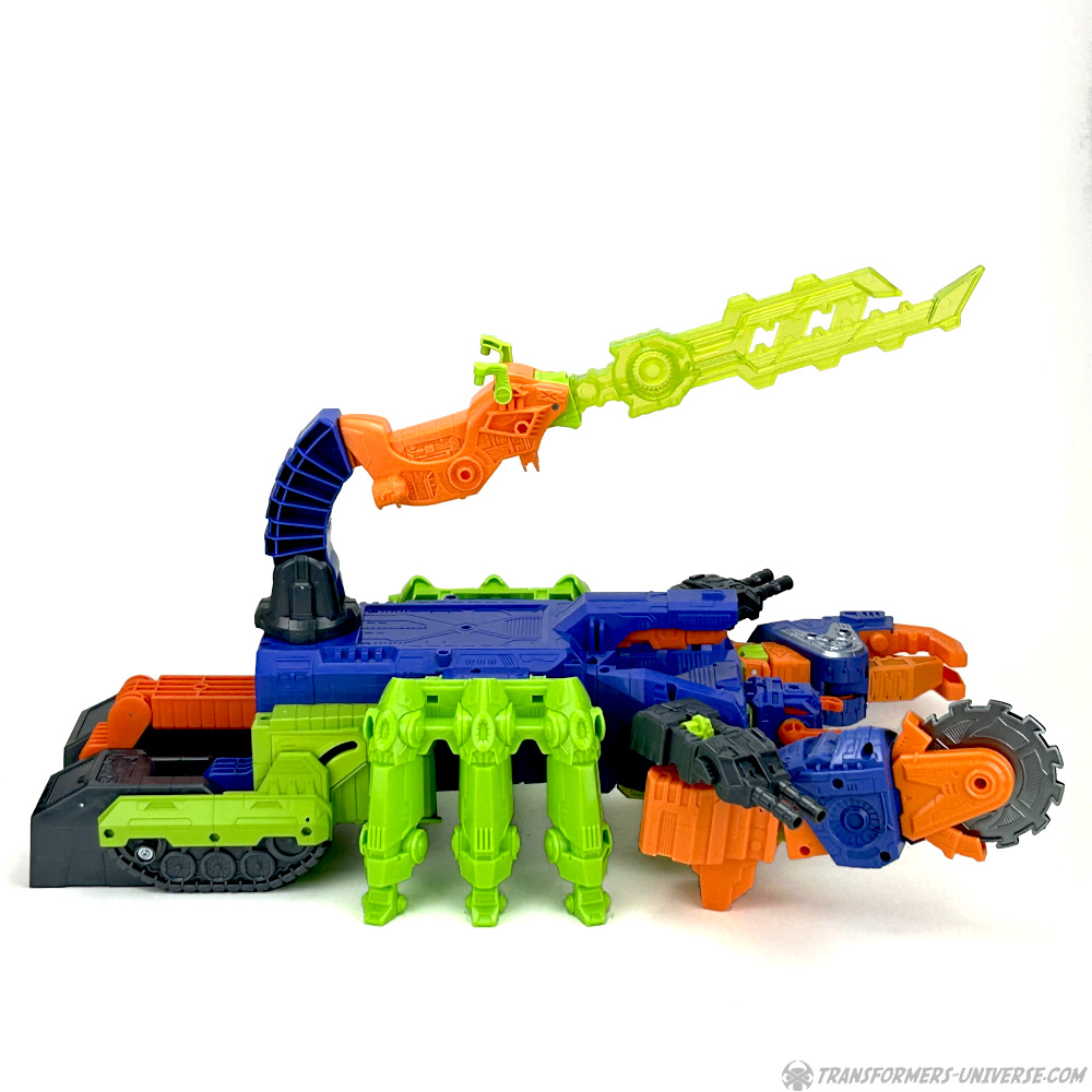 Alternativmodus: Scorponok ist möglicherweise der größte 1-Step Changer, der jemals gebaut wurde, denn seine Transformation ist tatsächlich nur ein einziger Schritt. Man greife den Griff auf seinem Rücken, drücke den roten Part runter, und kippe den Roboter nach vorne, bis er auf dem Bauch liegt, fertig. Okay, die Arme muss man noch über den Kopf drehen, aber das war’s dann auch wirklich. Jetzt ist er ein Skorpion, mehr oder weniger. Aber sein wir ehrlich, der originale Scorponok hatte jetzt auch keine wirklich komplexere Transformation. Allerdings verzichtet Cyberworld Scorponok auf den City Mode.