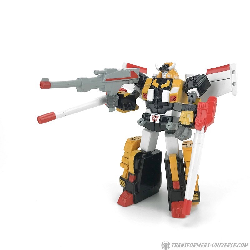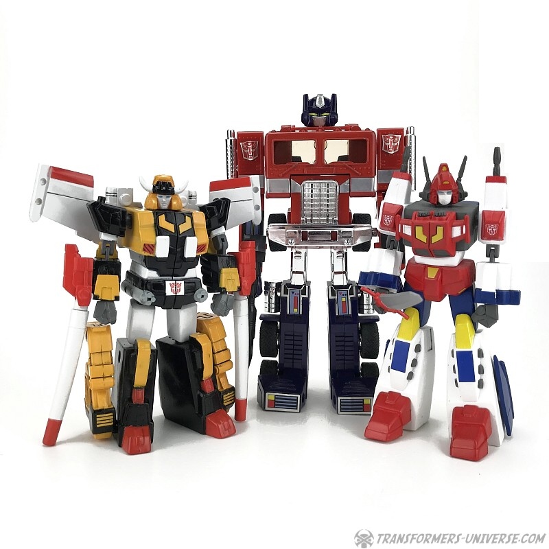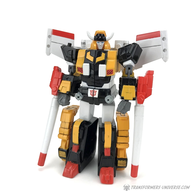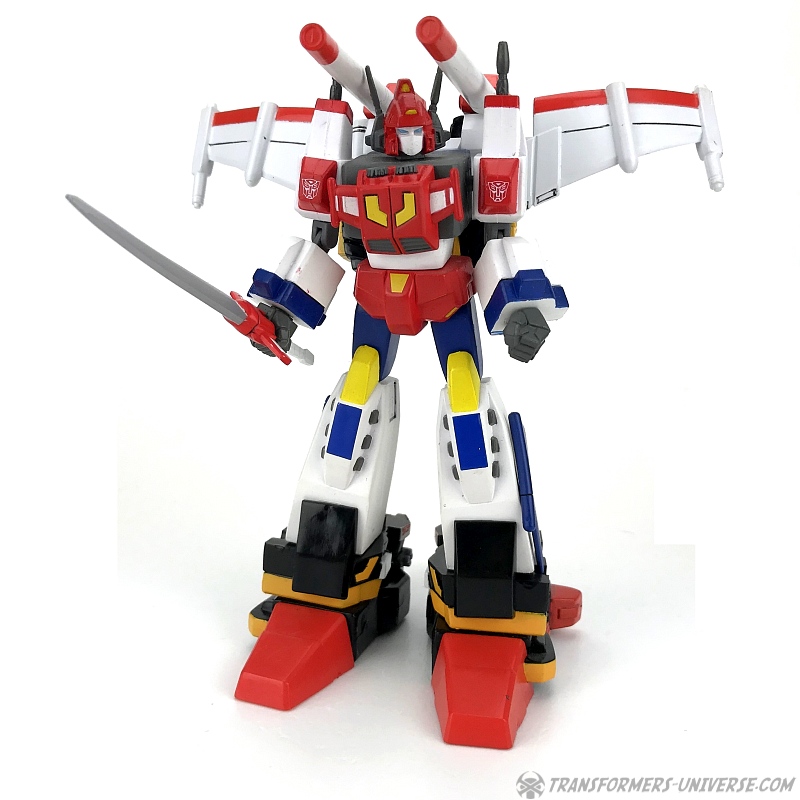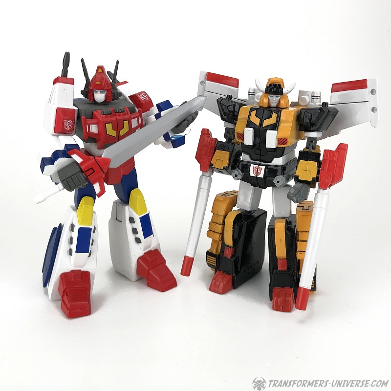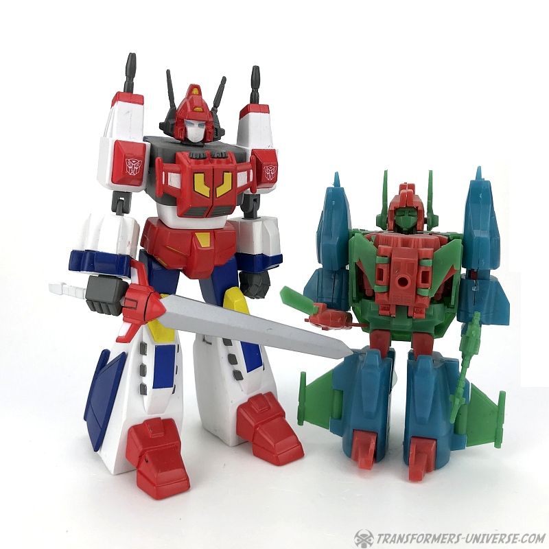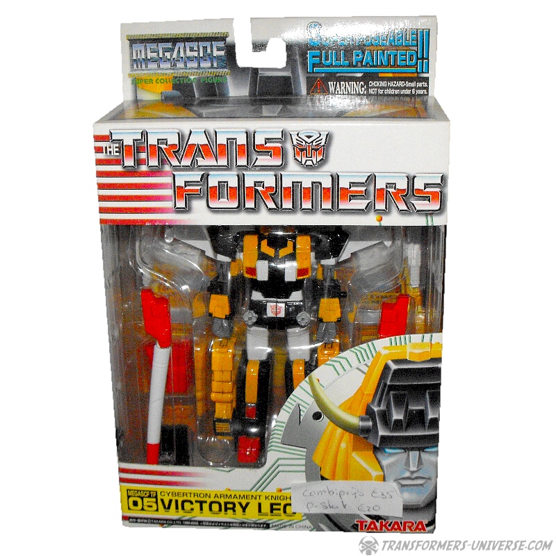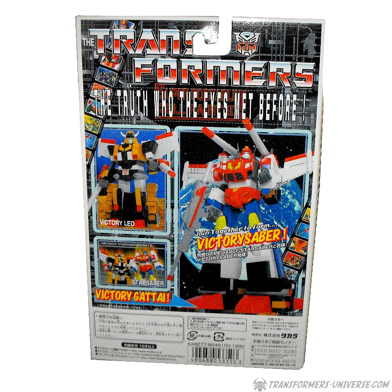 Bemerkungen: Takaras MegaSCF Reihe bestand aus klassischen G1 Charakteren, sowie solchen aus der damals aktuellen Armada / Micron Legend Reihe. Star Saber und Victory Leo waren die einzigen Vertreter der Takara G1 Cartoons in der Reihe (die gerade mal 15 Figuren umfasste, ein Drittel davon hießen Convoy) und die einzigen, die sich kombinieren konnten. Wie sind diese beiden Kerlchen in meine Sammlung gekommen? Eigentlich war es ein Missverständnis. Damals im Jahr 2006 war ich noch recht neu in der Transformers Sammlerszene und erspähte diese beiden auf dem Tisch eines Händlers auf der Auto Assembly in England. Da ich mich auf der japanischen Seite der Transformers noch nicht gut auskannte, hielt ich sie für die Robot Masters Versionen der Charaktere, die sich ja transformieren konnten (und für den Preis ein absolutes Schnäppchen gewesen wären). Erst später im Hotelzimmer merkte ich, dass das hier nicht-transformierbare Figuren waren, aber da war es schon zu spät.