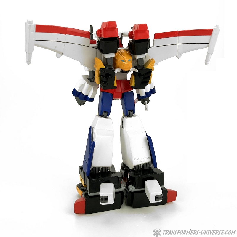 Die zweite Figur in diesem Review ist Victory Leo (früher als God Ginrai bekannt). Auch er ist eine nicht-transformierbare Actionfigur und hält sich sehr nah am Look des animierten Charakters aus dem Cartoon. Von der Beweglichkeit ist er praktisch identisch mit Star Saber und er hat nicht weniger als drei Kanonen dabei. Zwei weiße, die er auf die Unterarme stecken kann, sowie ein großes graues Gewehr. Er hat nicht ganz so viele Hände dabei wie Star Saber, neben der die fest mit Gewehr verbunden ist gibt’s nur noch zwei Fäuste dazu. Vermutlich weil er noch ein paar Extrateile für den Kombinationsmodus dabei hat (siehe unten). Somit unterm Strich für Victory Leo: nicht ganz so elegant wie Star Saber, aber trotzdem eine nette kleine Actionfigur.