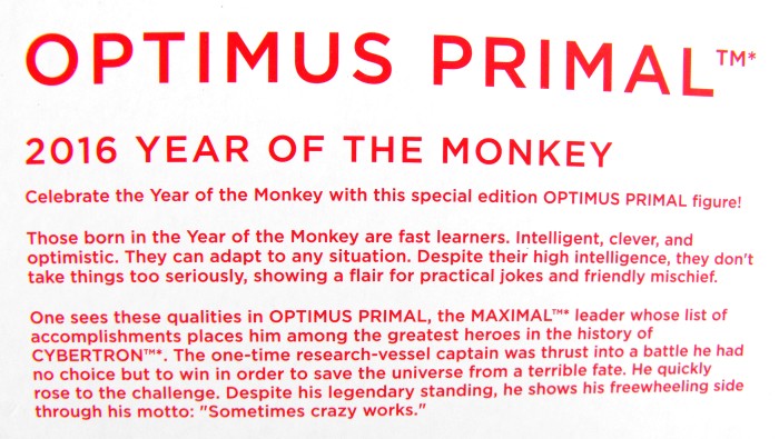 Vorwort: Platinum Edition Year of the Monkey Optimus Primal ist ein Repaint von Robots in Disguise Air Attack Optimus Primal, den ich schon 2005 rezensiert habe (echt? Ich mache das jetzt schon seit über 12 Jahren?). Da es aber schon mehr als ein Jahrzehnt zurückliegt und die Figur ein Geschenk meines guten Freundes Caked-Up ist, darf hier ruhig mal ein komplettes Review her. Leider schreibe ich dieses mit einem weinenden Auge, denn mein originaler RID Air Attack Primal erlitt schwerste Verletzungen, als ich ihn für diese Fotosession transformieren wollte. Das goldbraune Plastik an seiner Hüfte zersplitterte wie Glas. Ich hab‘ ihn zwar wieder zusammengeklebt, aber ich fürchte er wird niemals wieder transformieren können.