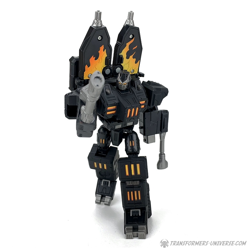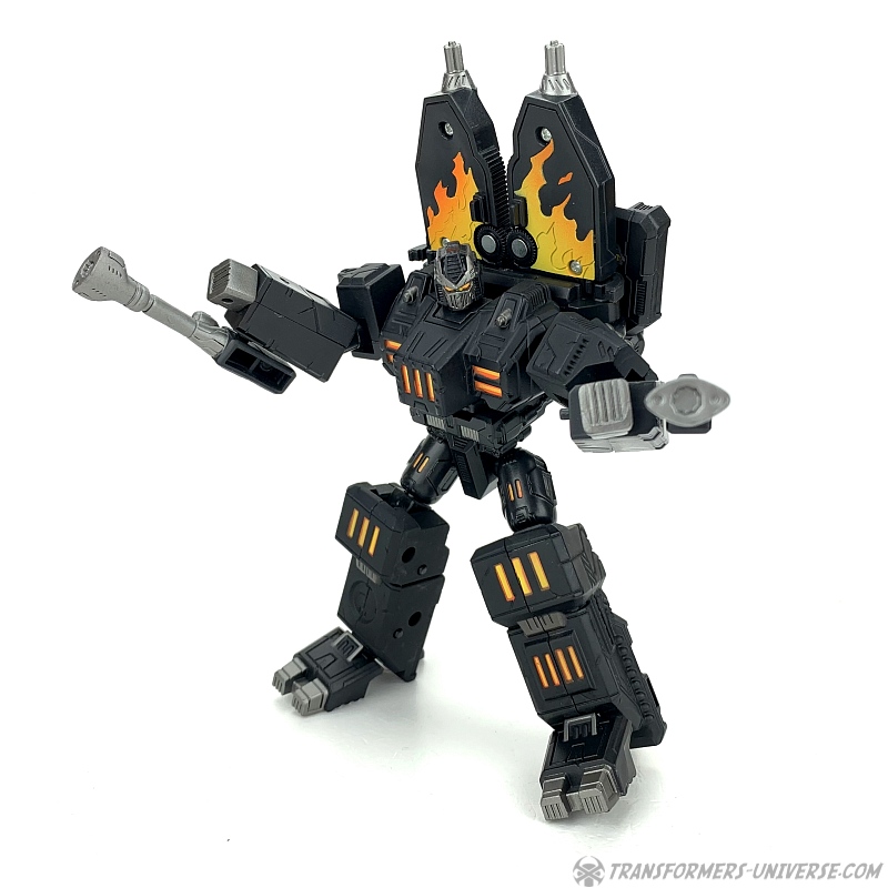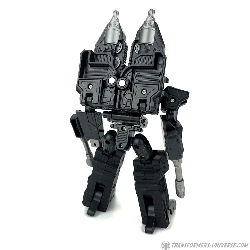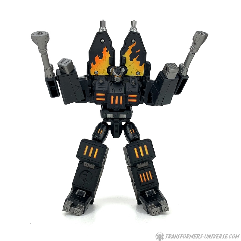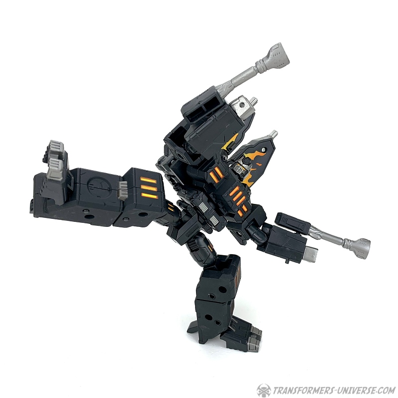 Wie die meisten Titanium Figuren ist er sehr gut beweglich, allerdings sind seine Gelenke recht locker und die teils metallischen Gliedmaßen sind relativ schwer. Es ist somit zwar möglich, ihn in alle möglichen Posen zu bringen, aber er ist nicht die am besten ausbalancierte Figur aller Zeiten. Die Kanonen an seinen Armen sind auch eher locker, aber solange man nicht zu dynamisch mit ihm spielt, geht da nichts ab. Seine Fäuste sind eigentlich nur graue Blöcke mit ein paar Linien darauf, somit kann er nichts halten, aber da seine Kanonen ja an den Unterarmen stecken, geht das okay.