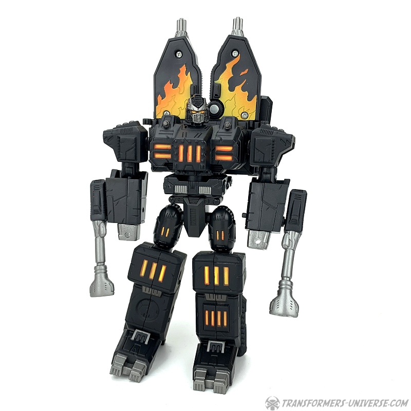 Robotermodus: Fangen wir mit einem generellen Problem der Titanium Serie an, nämlich dass alle Figuren gleichgroß sind. The Fallen sollte auf jeden Fall größer sein als ein „normaler“ Transformer, also mal allermindestens Voyager-Größe, aber hier ist er halt nur etwa Deluxe-groß. Davon aber abgesehen sieht er verdammt beeindruckend und mächtig aus. Er ist größtenteils schwarz mit zahlreichen Schlitzen, die an einen Stahlofen erinnern, wo im Inneren ein Feuer lodert. Die Paneele hinter seinem Rücken sind mit Flammen bemalt, um den Eindruck zu vermitteln, er stünde in Flammen (wie bei seinen Comic-Auftritten).